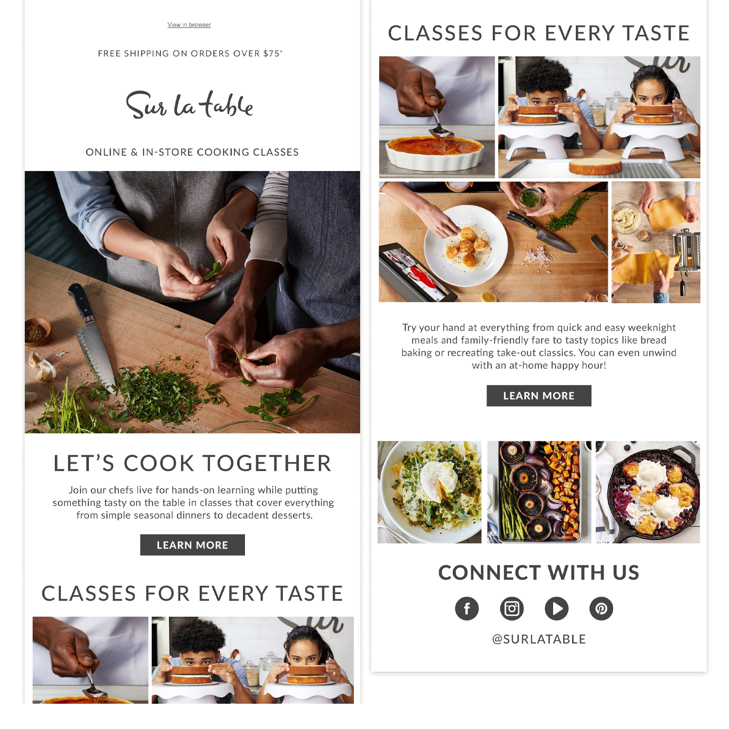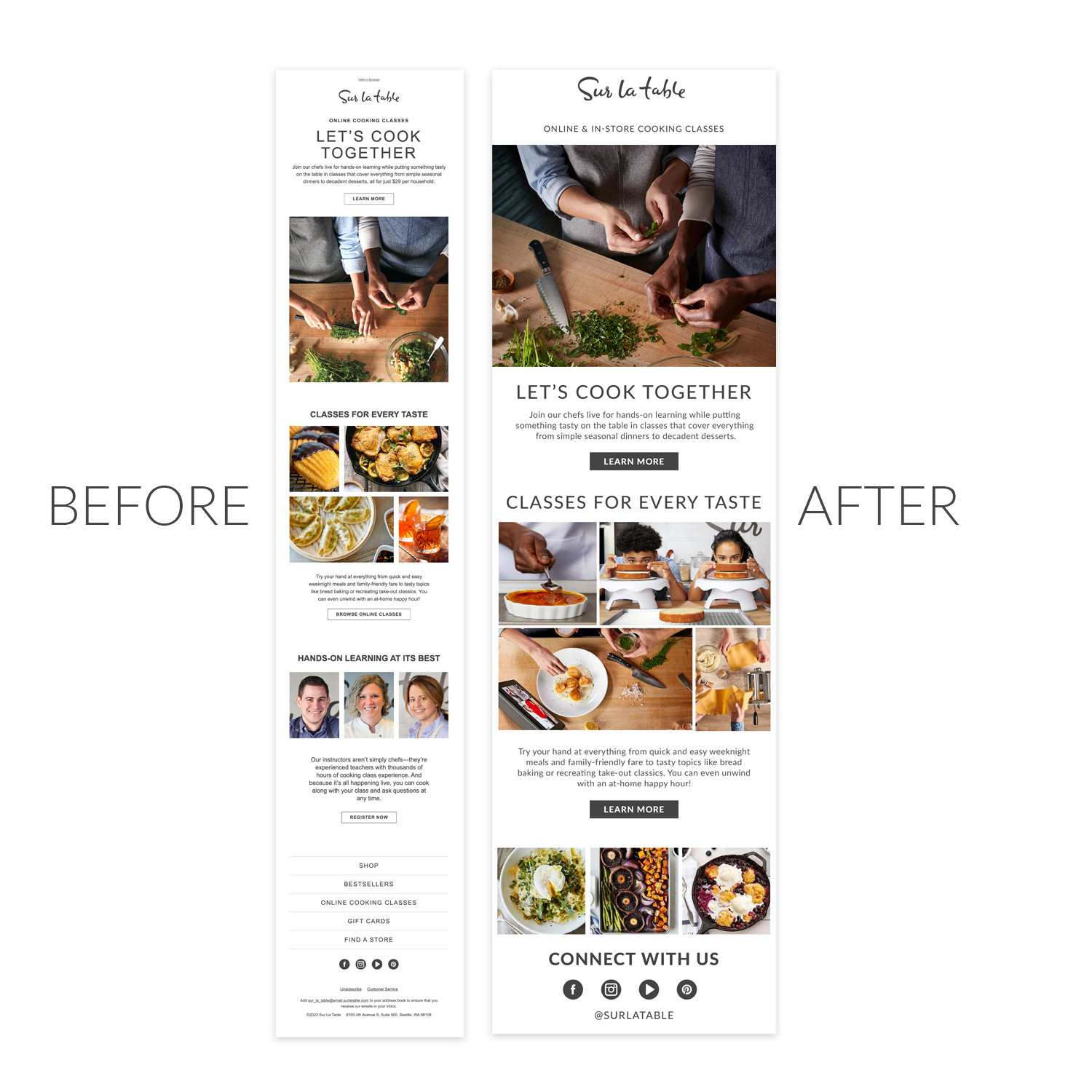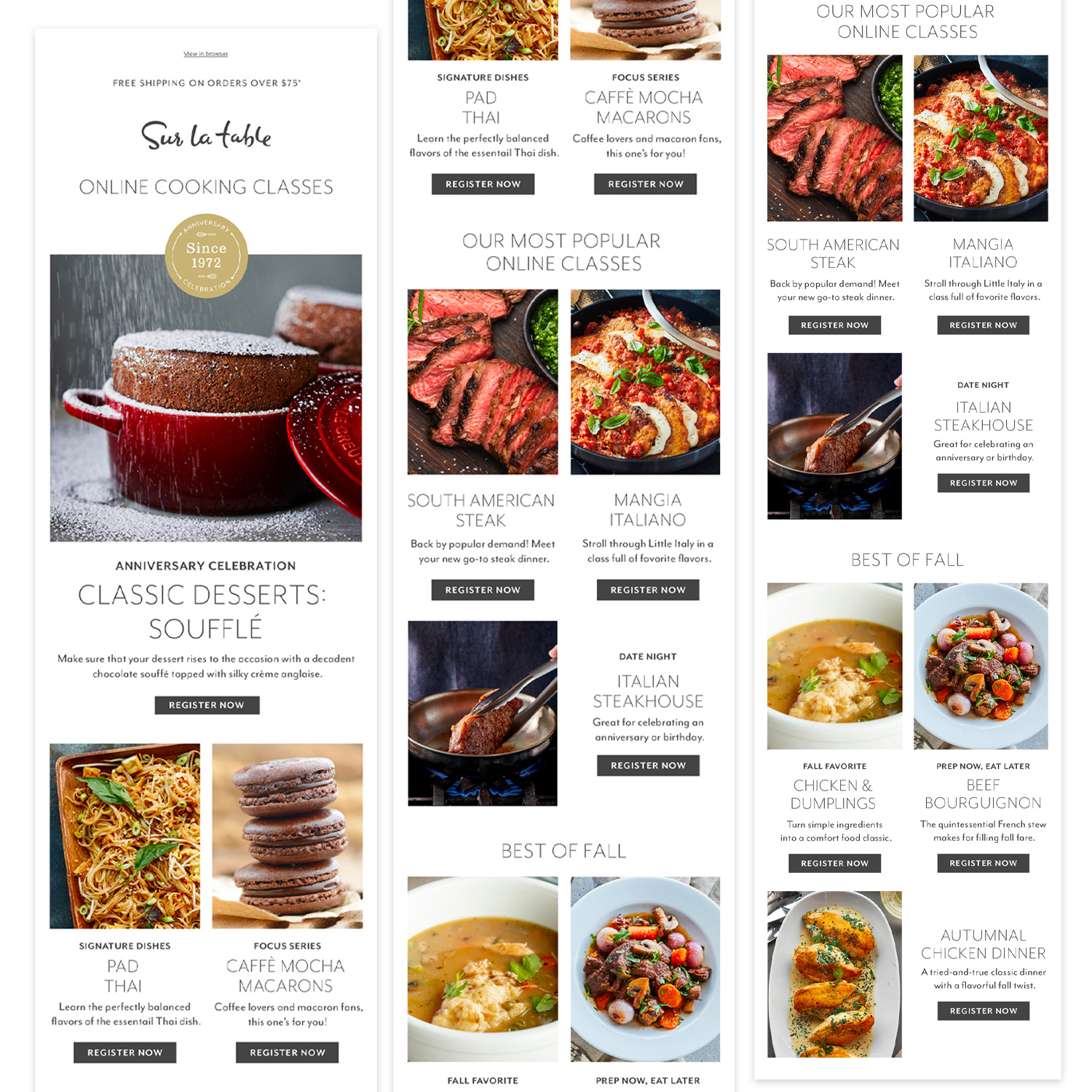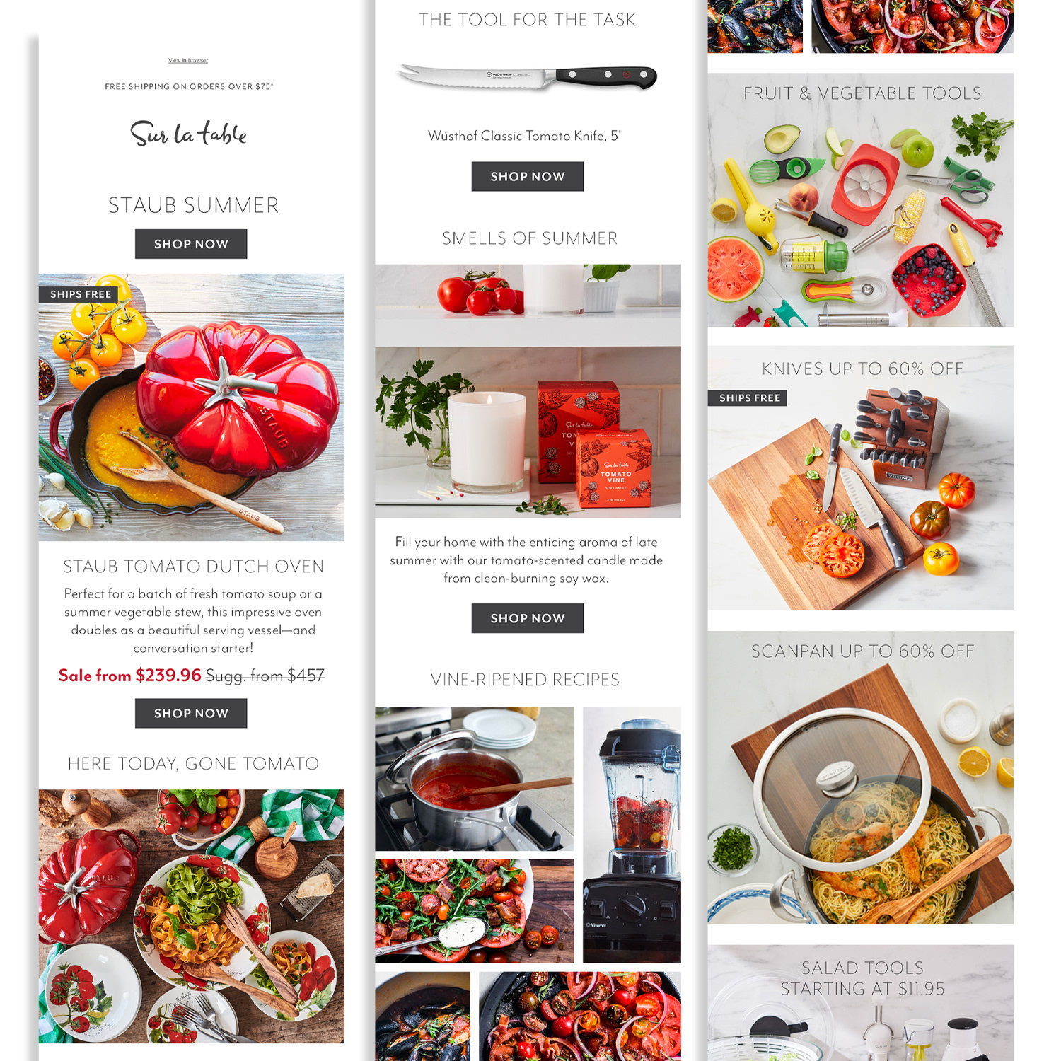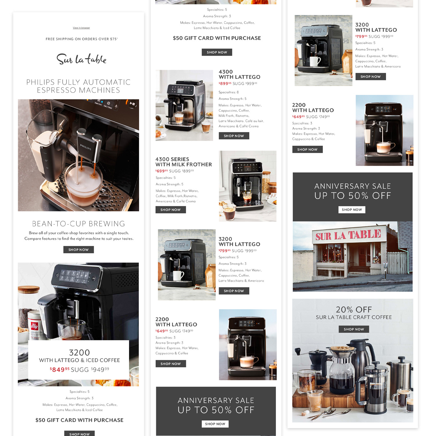 Designed and deployed 3–4 emails daily on a tight production schedule, rigorously adhering to Sur La Table’s brand standards with dynamic content, bold CTAs, and visually striking graphics.