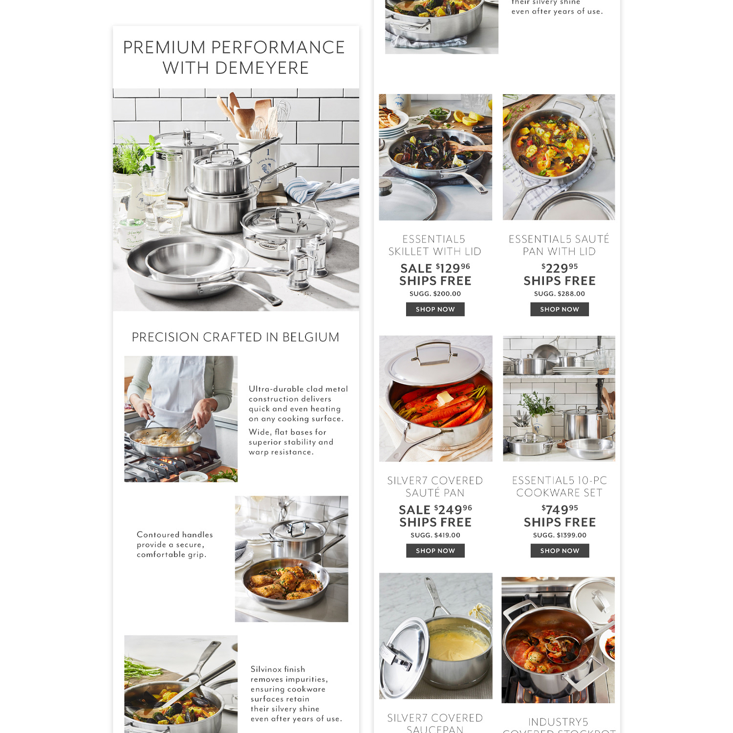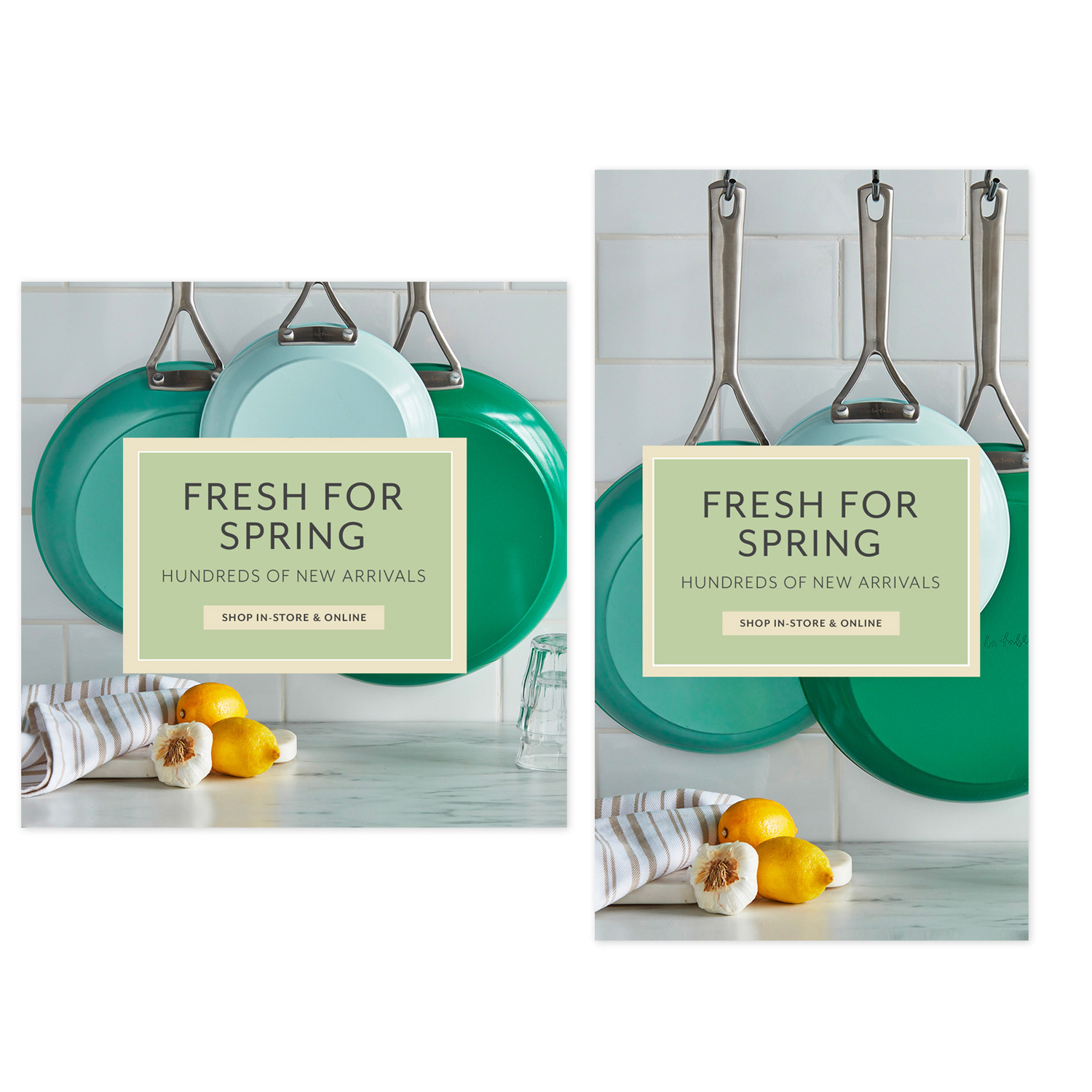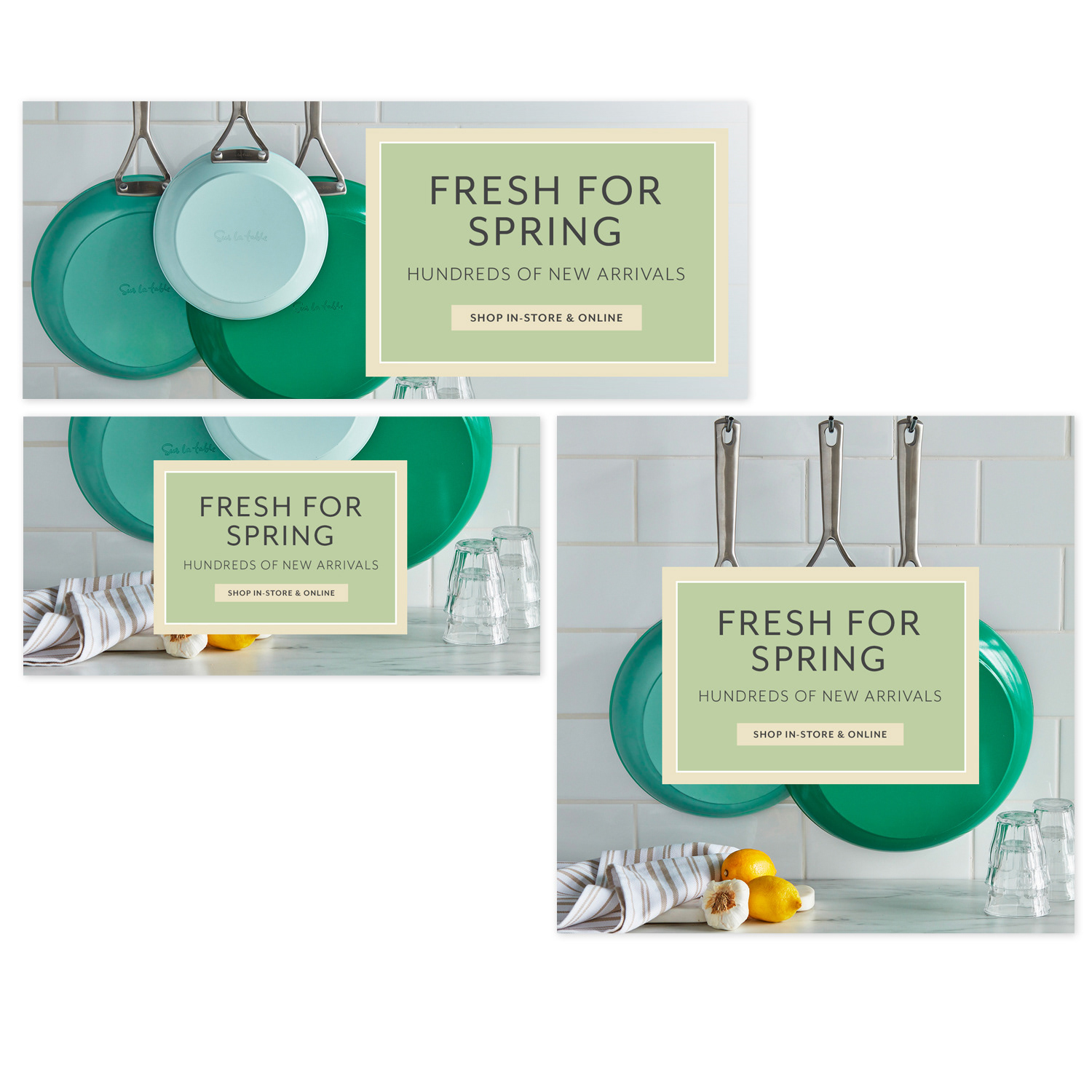 The Fresh for Spring campaign welcomed the season with a vibrant showcase of new kitchen arrivals, anchored by a stunning gradient of green nonstick frying pans in sage, pistachio, and emerald hues. Custom web banners, crisp email headers, and lush social media assets bathed feeds in refreshing spring tones, pairing the colorful cookware with pastel linens and modern tools. The cohesive, nature-inspired palette sparked excitement for renewal, driving traffic and sales as customers eagerly refreshed their kitchens for brighter days ahead.
