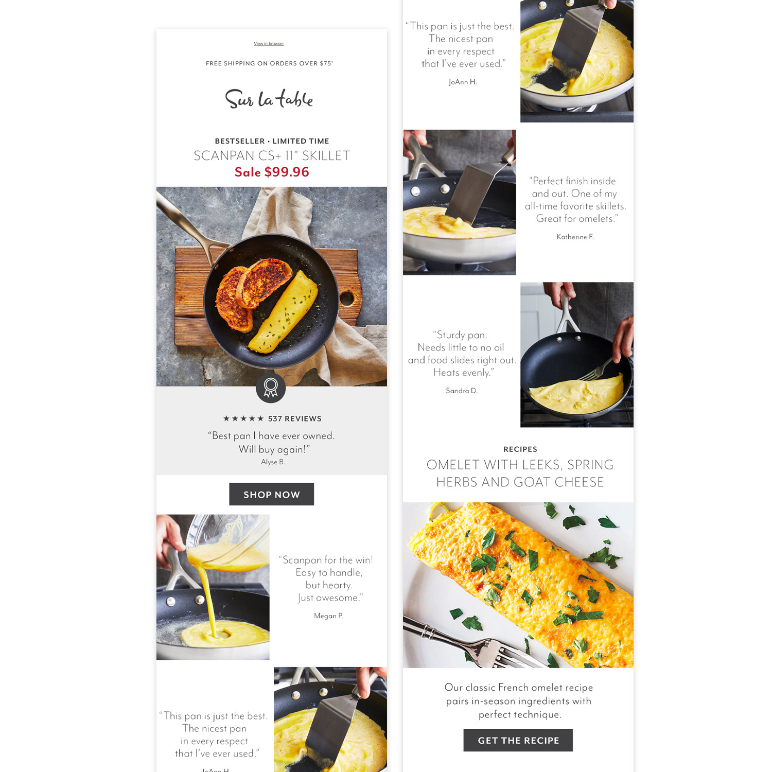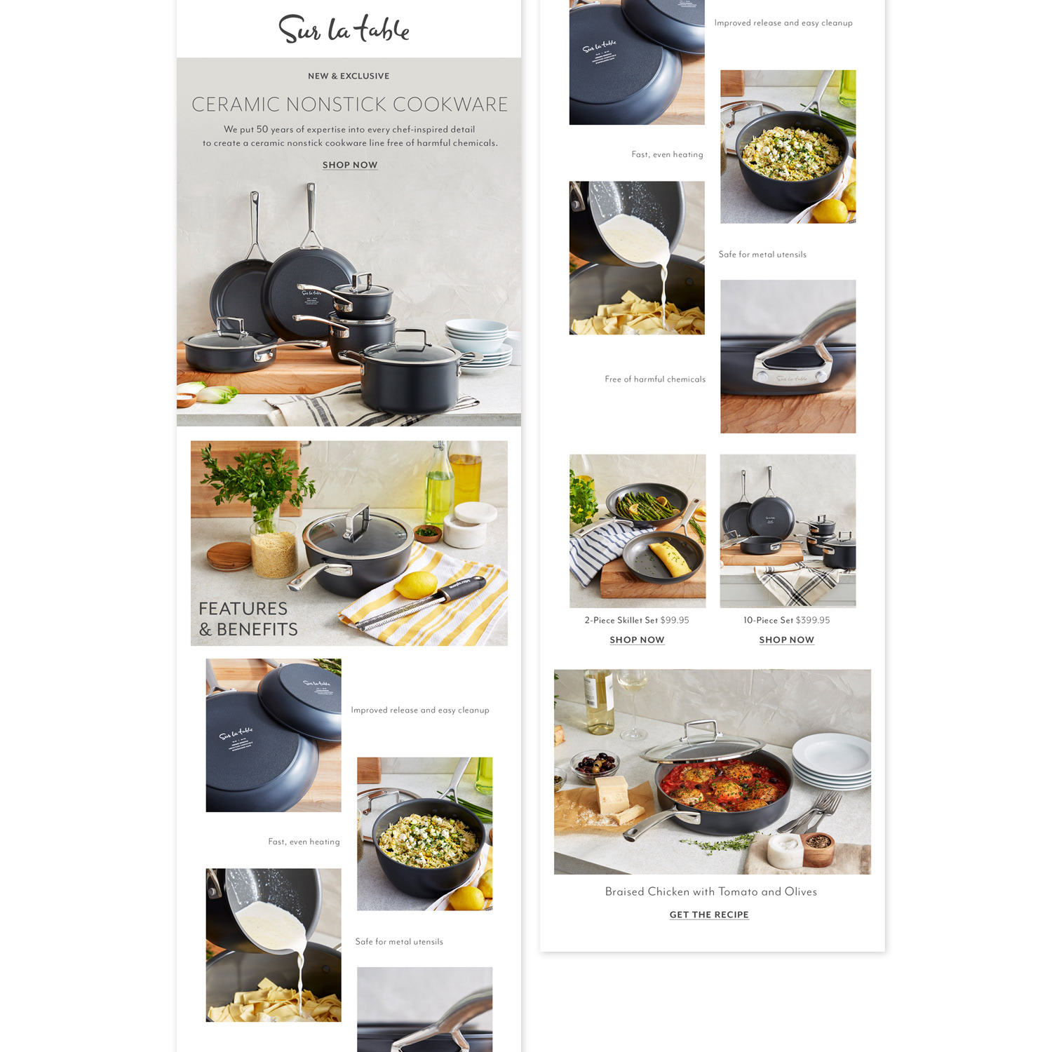 Designed a high-energy Instagram Stories series and matching email layout campaign to launch Sur La Table’s premium ceramic nonstick cookware line. Crafted swipe-up animations with sizzling product close-ups, chef tips, and limited-time offers—driving direct traffic to PDP. Paired with a responsive email template featuring bold hero visuals, scannable benefit bullets, and a glowing CTA button. Delivered cohesive, on-brand storytelling that boosted click-through rates, accelerated add-to-cart actions, and positioned the collection as the must-have healthy cooking upgrade.