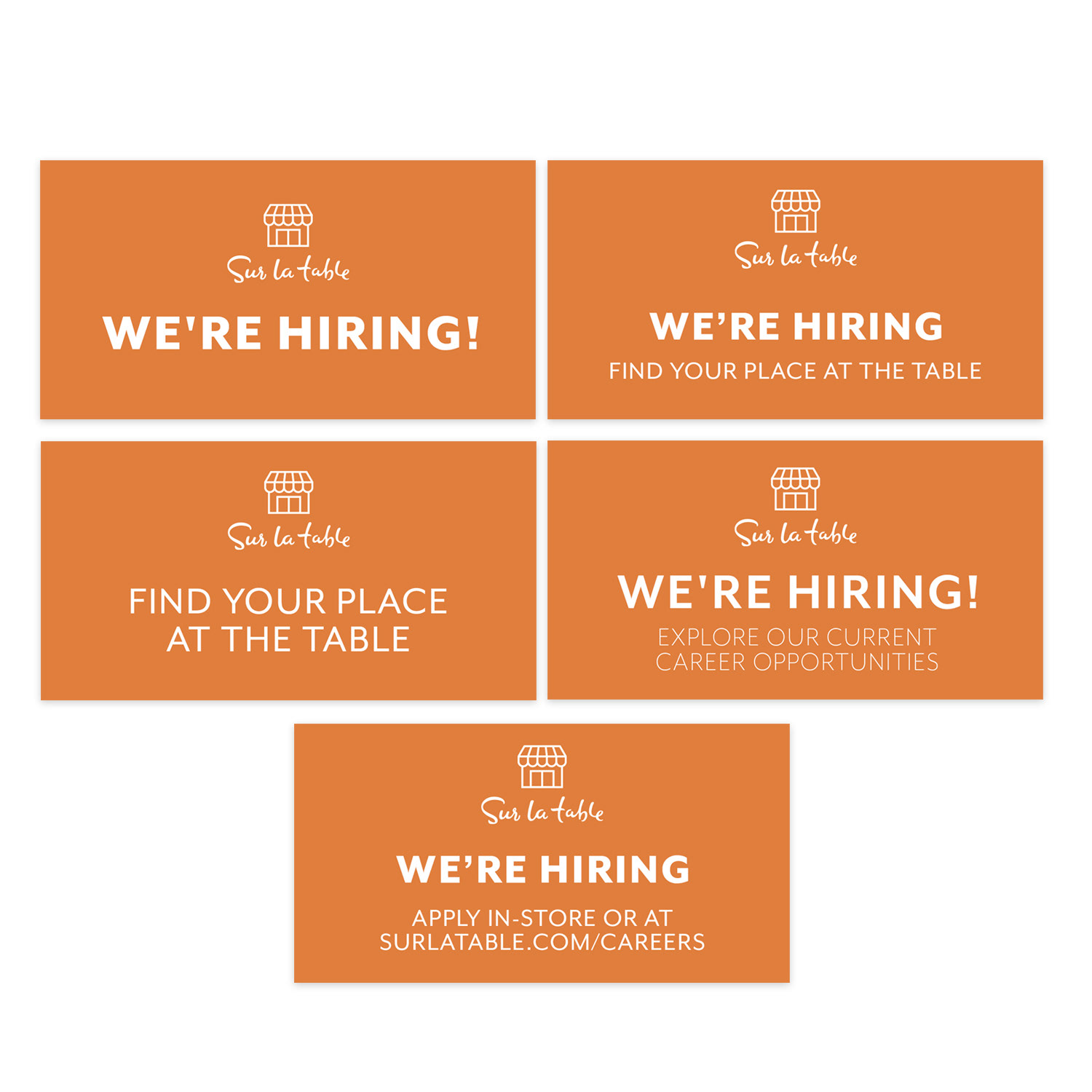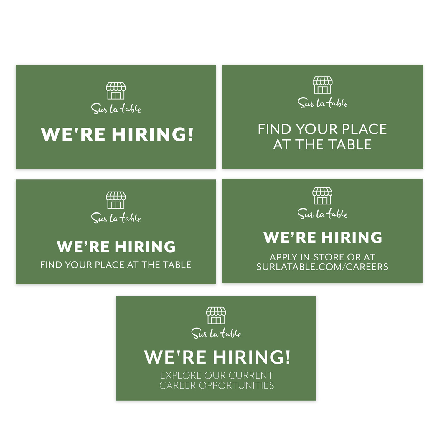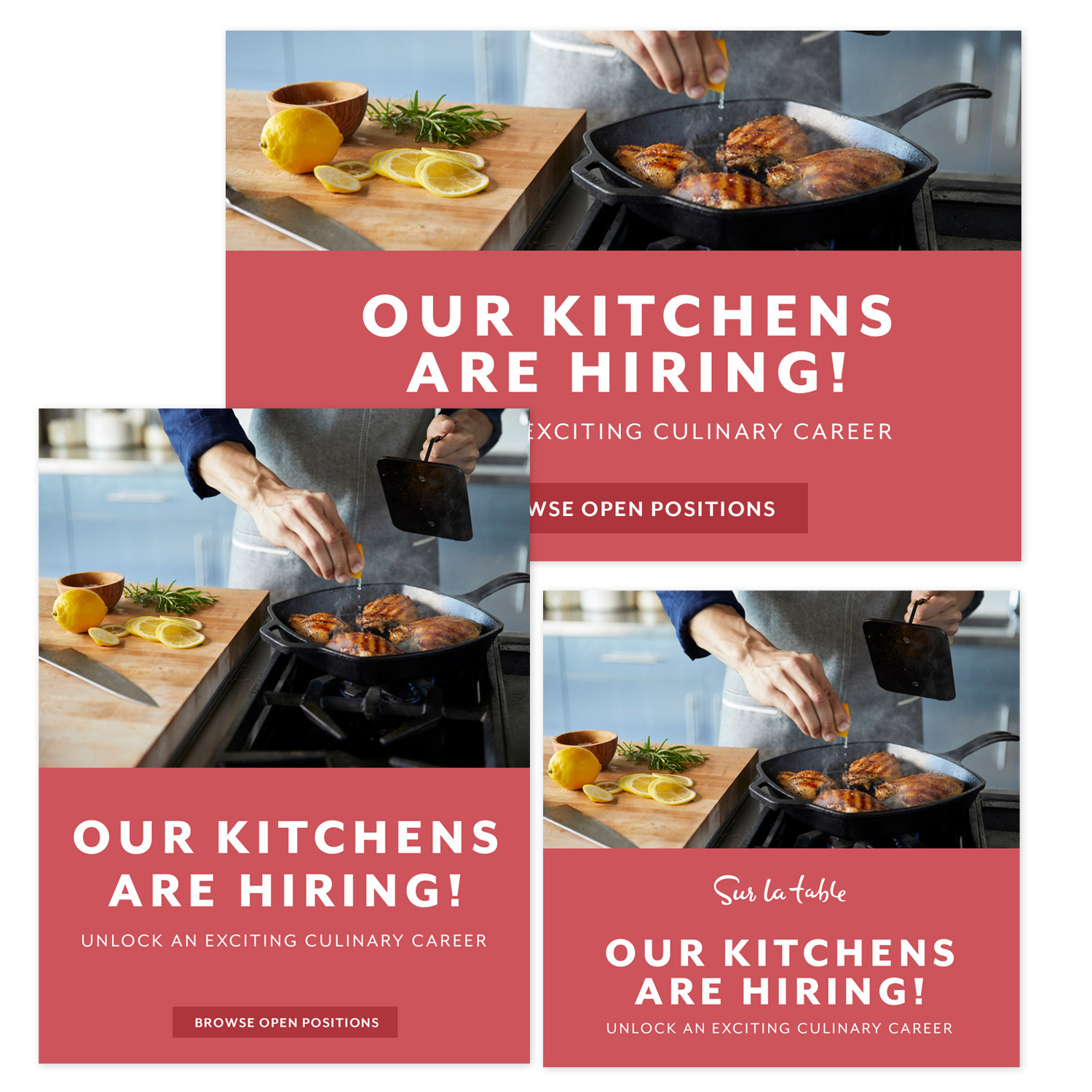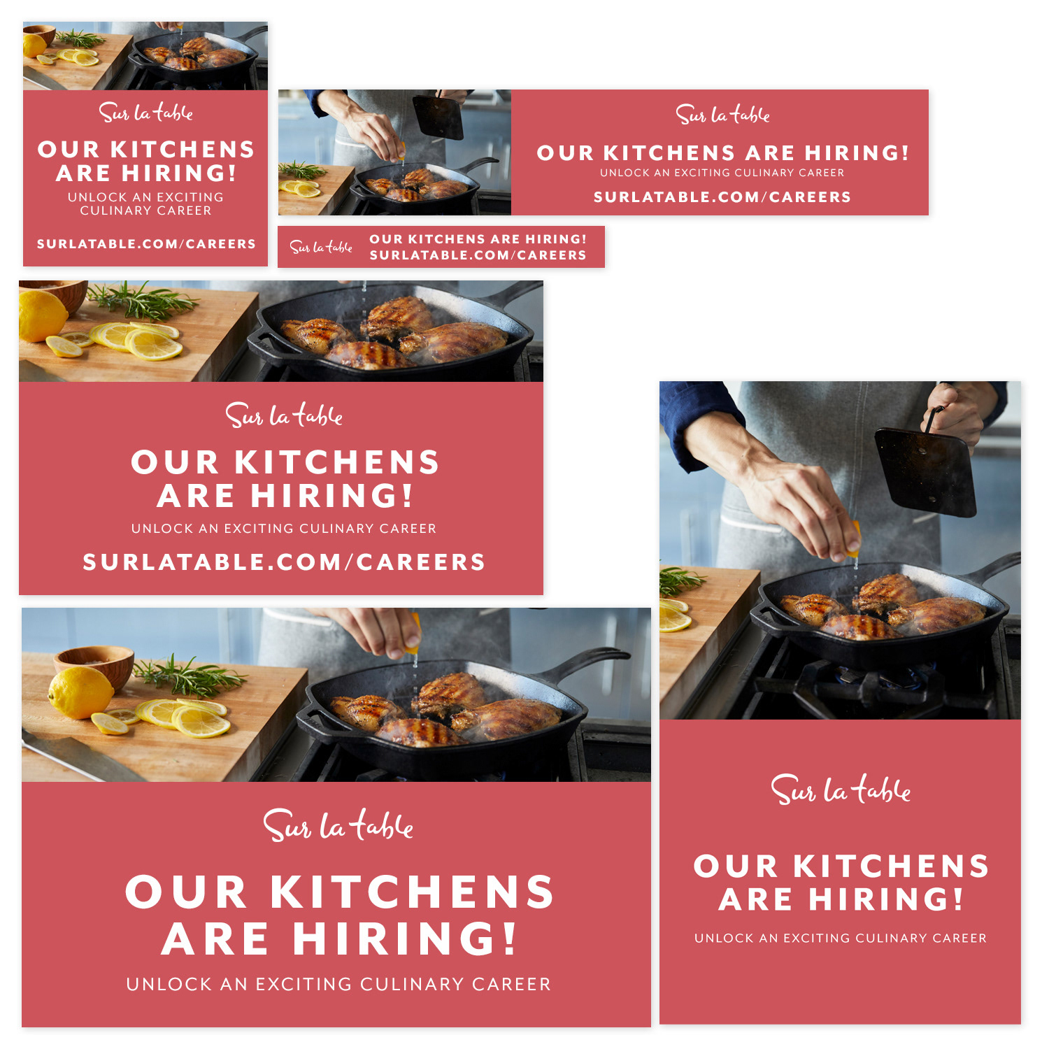 The “We’re Hiring” recruitment campaign invited kitchen enthusiasts to turn their passion into a pay-check at one of Sur La Table’s 59 stores across the U.S. Clean calls-to-action (“Find your place at the table”) paired with simple corporate icons and colours made joining the team feel like stepping into a community that lives and breathes great food, driving a surge of qualified applications from coast to coast. The banners were evergreen banners that lived on the corporate website.