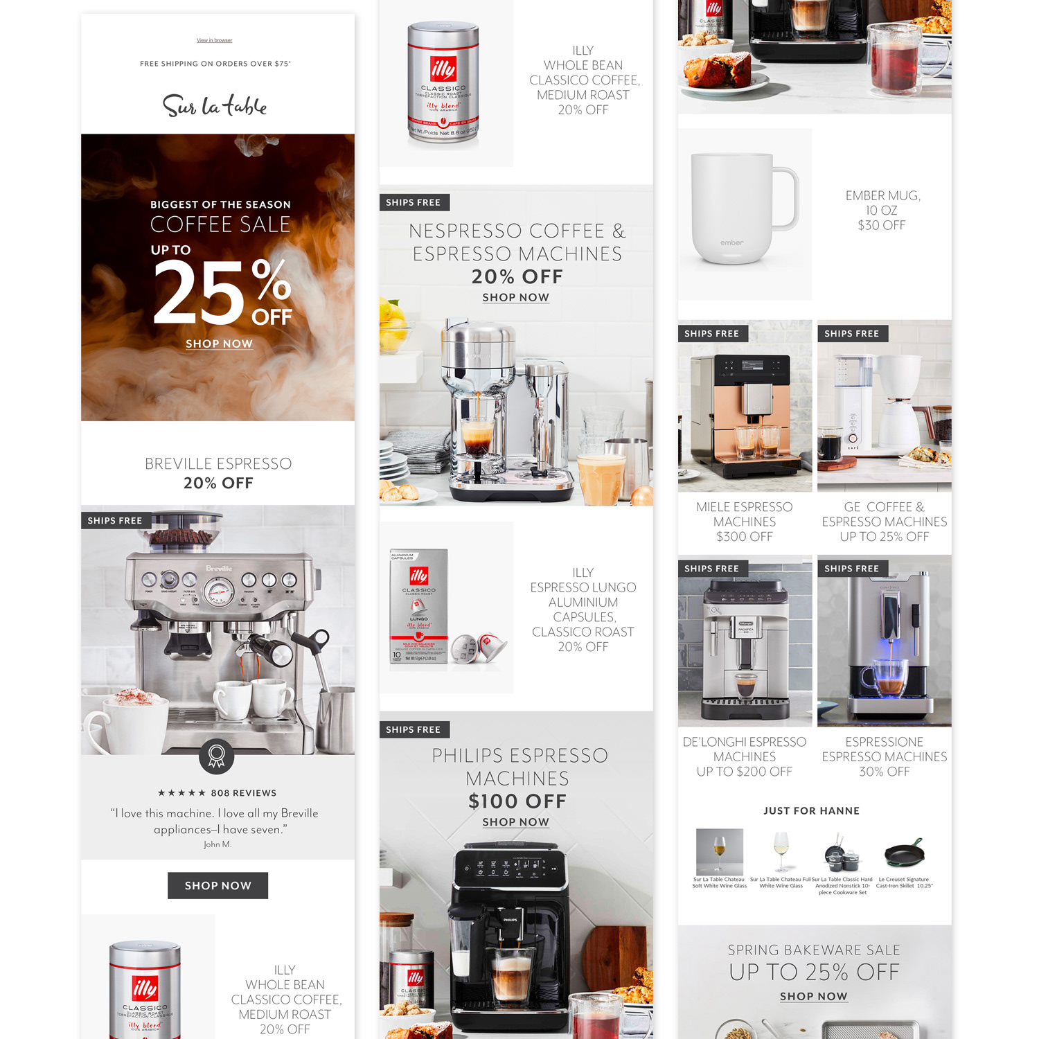 The Coffee Sale campaign for Sur La Table brought the rich aroma of savings to life with fully animated marketing assets across every channel. Vibrant animated email blasts, mesmerizing web banners, and eye-catching social media carousels and stories showcased discounted espresso machines, pour-over gear, and premium coffee accessories in fluid motion that turned passive scrolling into instant craving and clicks.