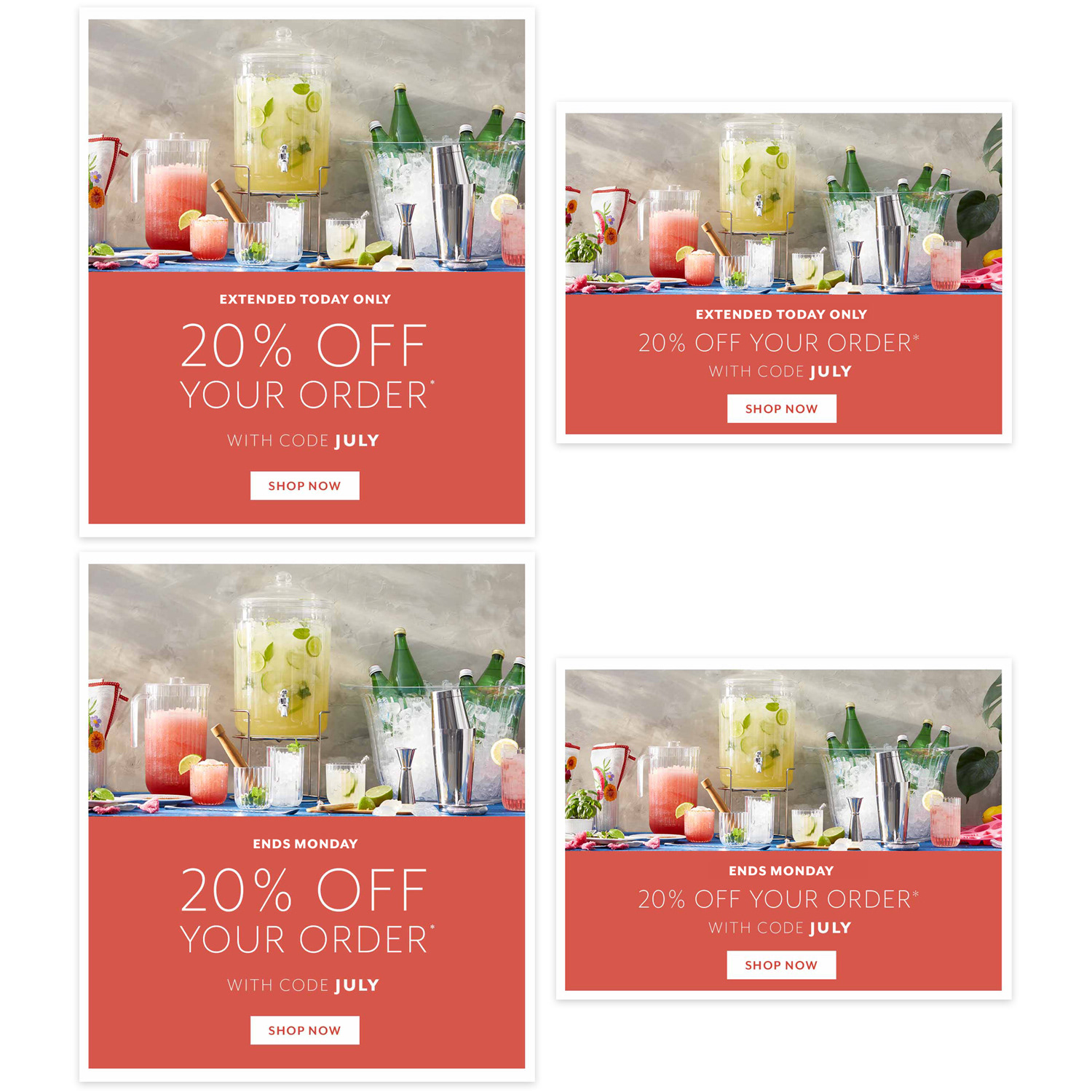 The 20% Off site-wide summer campaign drenched Sur La Table’s channels in pure seasonal heat. A fresh family of website and social banners showcased grill tools, bright melamine serveware, pastel ice-cream makers, and citrus presses against sun-bleached backdrops. Clean, bold lockups screamed “Take 20% Off Everything” while vibrant product photography promised backyard parties and lazy patio dinners, turning the limited-time offer into the hottest click of the season.