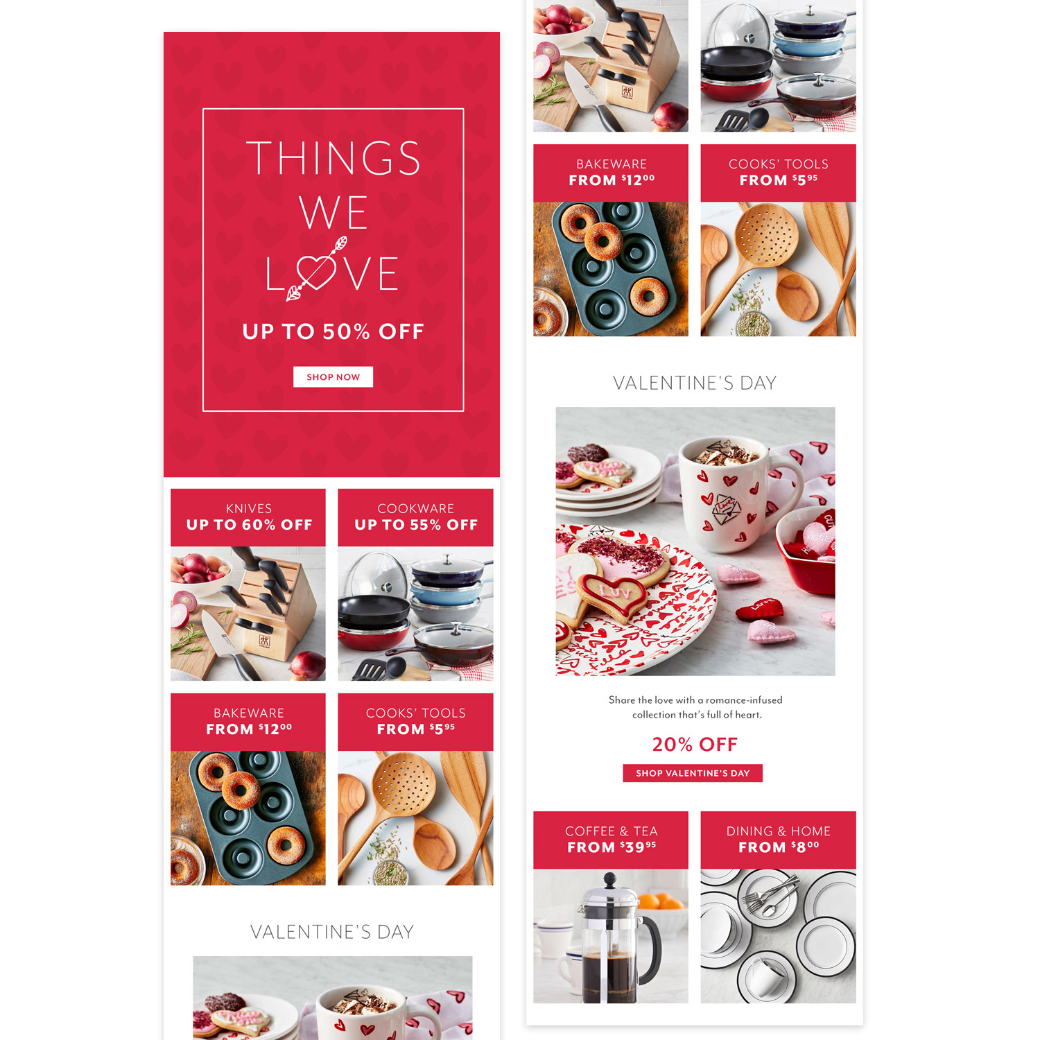 The “Things We Love” campaign turned February affection into irresistible clicks with a single, swoon-worthy animated banner. Across emails, website headers, and social stories, the word LOVE appeared with the heart-shaped O. An arrow flies in from the left, striking the heart. The playful, perfectly timed animation made every open and scroll feel like falling in love, driving record engagement and sales for the season’s most lovable kitchen finds.