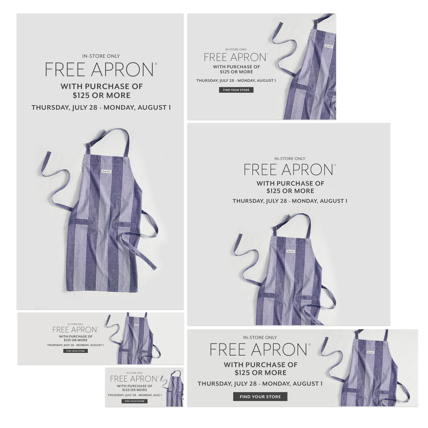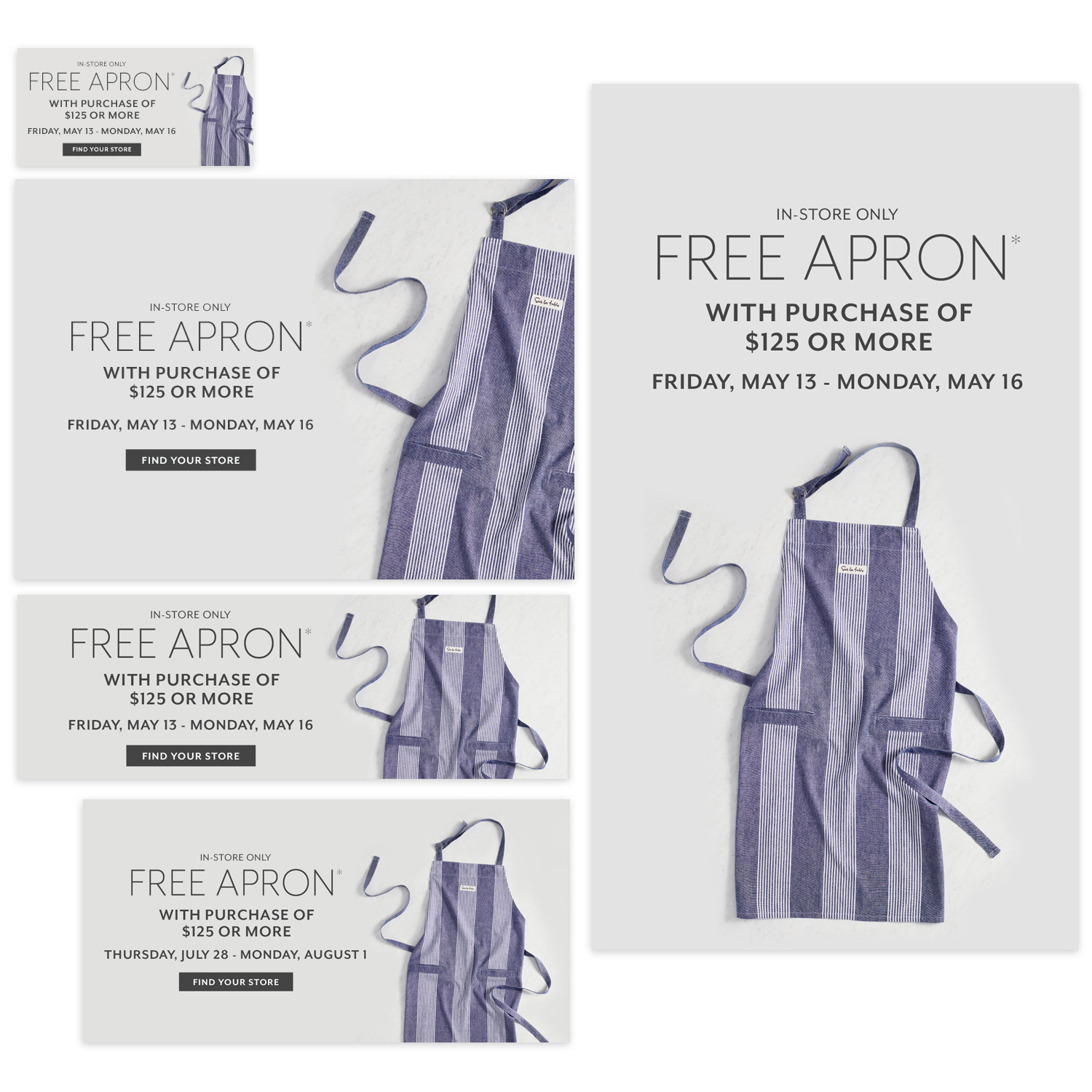 The Free Apron in-store promotion turned every $125+ purchase into a stylish reward with an exclusive, limited-edition apron. Resized hero imagery of the apron starred across animated email banners where it danced on screen. The gift-with-purchase messaging created instant foot traffic and turned routine shopping trips into feel-good apron victories.