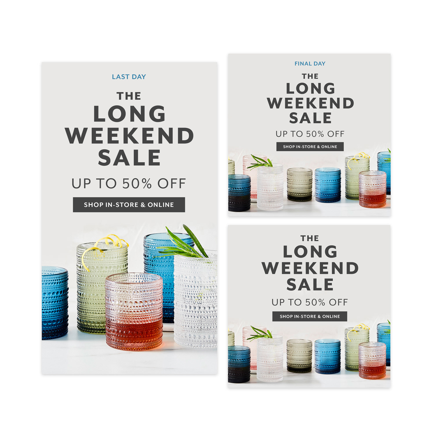 The Long Weekend Sale campaign turned relaxed holiday moments into vibrant celebrations with a kaleidoscope of colourful glassware. Custom banners created for third-party partners and affiliates showcased jewel-toned tumblers, stemless wine glasses, and festive pitchers in radiant sunset shades. The bright, summery visuals—optimized for email, site takeovers, and affiliate networks—sparked instant getaway vibes, driving traffic and sales as customers stocked up on drink-ware perfect for backyard barbecues and lazy porch evenings.