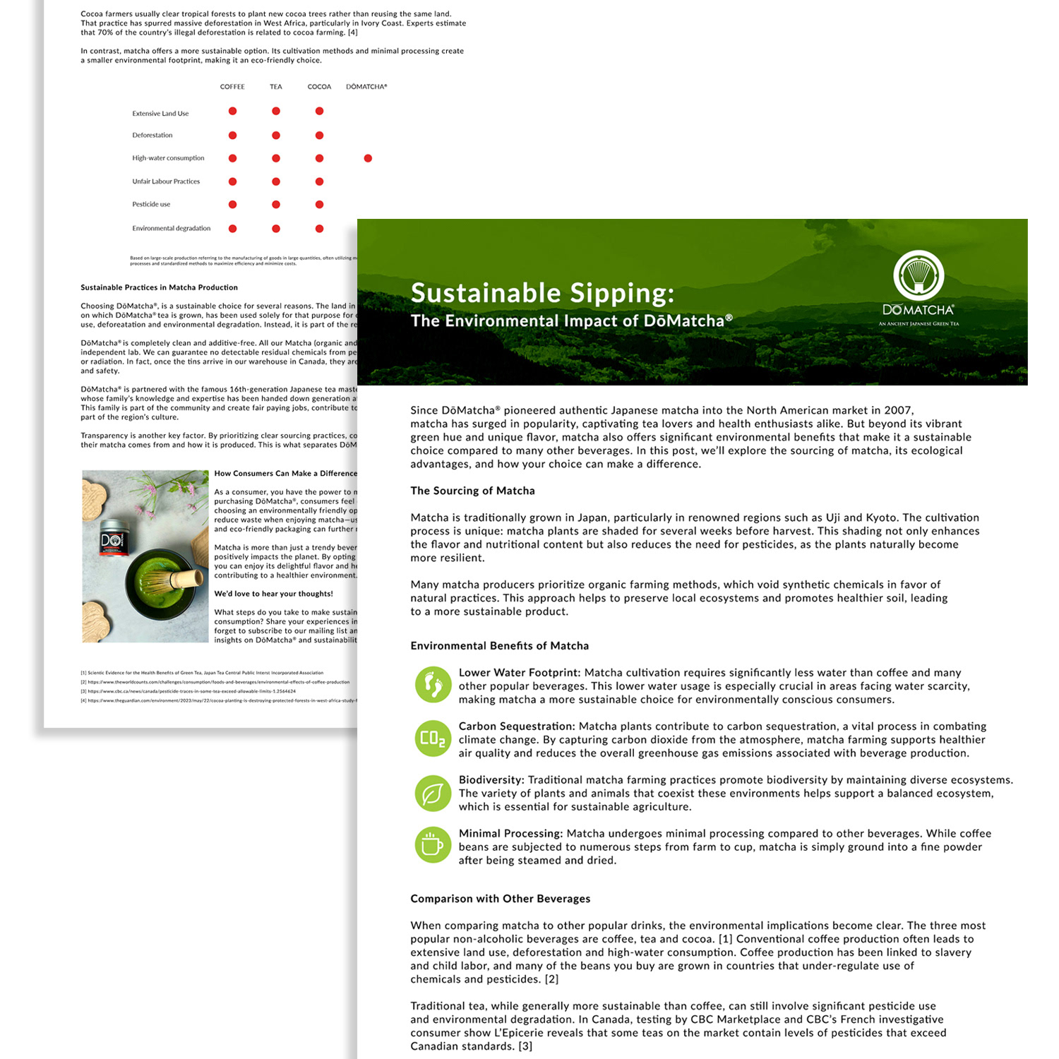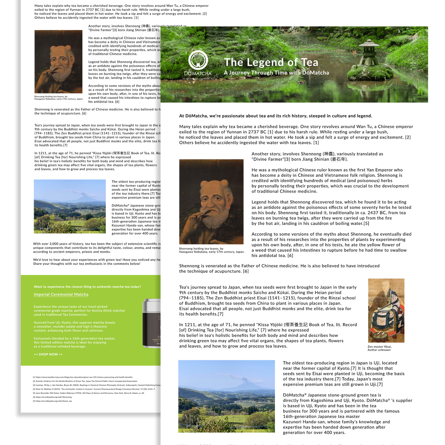 I wrote and designed a series of high-authority DōMatcha blog posts that positioned the brand as the definitive voice in premium matcha. Each article blended deep ceremonial-grade knowledge with scannable, trust-building formats: punchy subheads, bullet-point insights, data-backed stats, case studies, and quotes from tea masters.