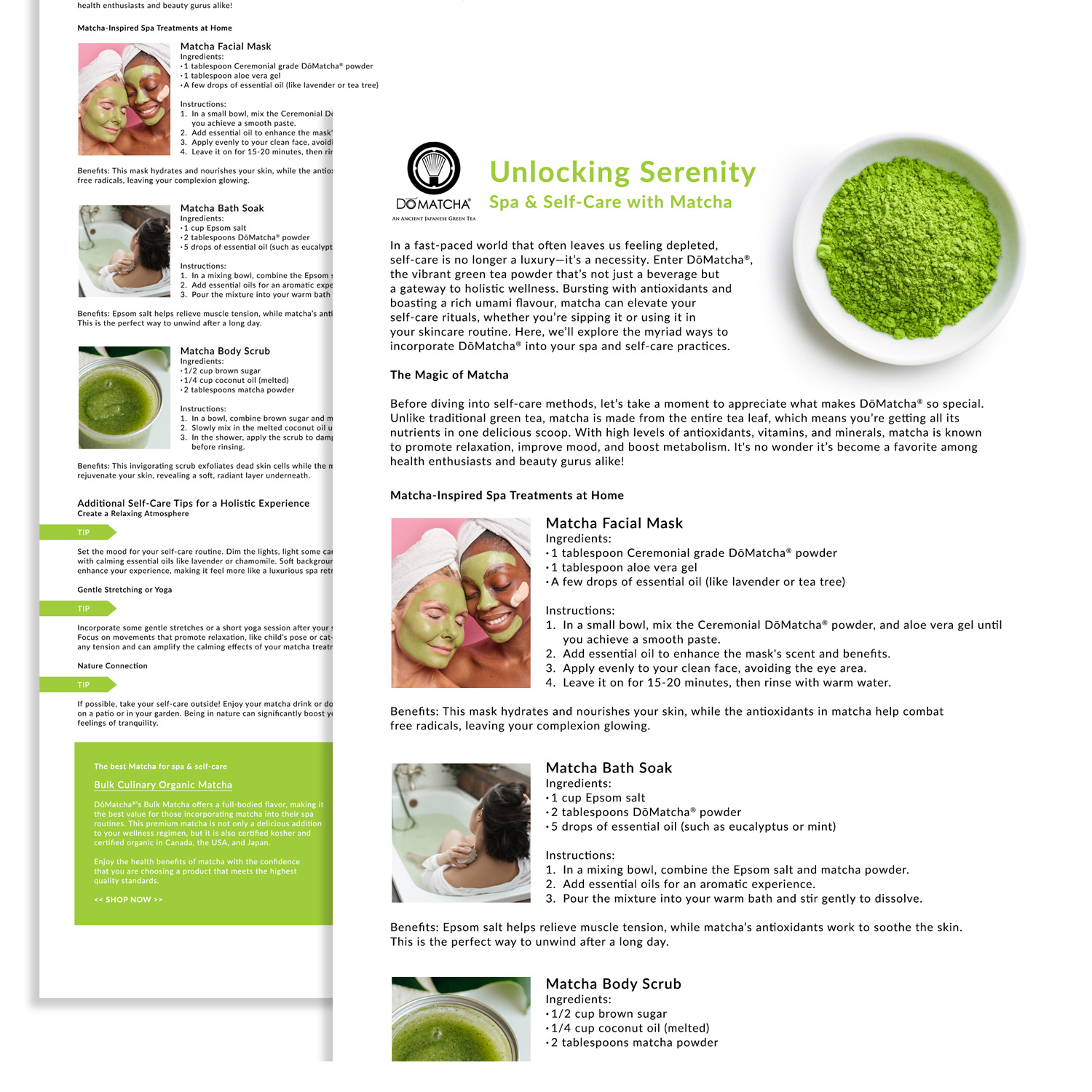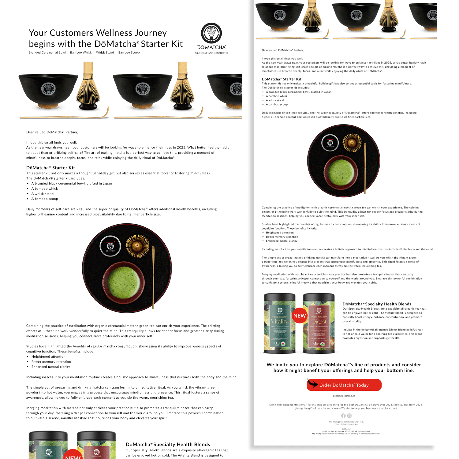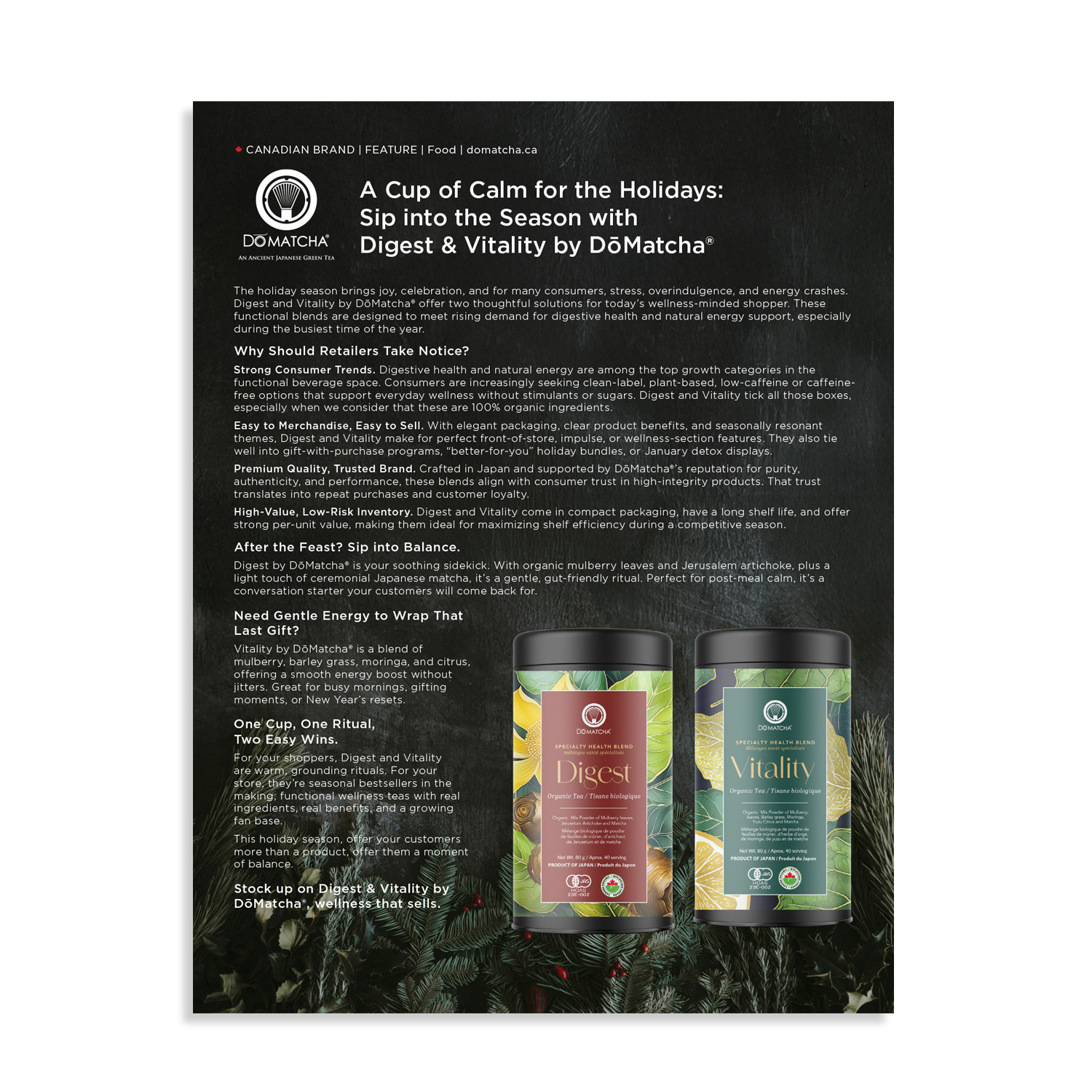 Wrote and designed a diverse series of printed advertisements and feature articles for DōMatcha, published in leading North American natural health and grocery trade magazines. Crafted compelling copy that educated retailers on matcha’s science-backed benefits, ceremonial heritage, and sales potential—paired with elegant, minimalist layouts featuring authentic Japanese imagery, clean typography, and premium product photography. Each piece drove inventory inquiries and in-store demos while reinforcing DōMatcha’s position as the gold-standard ceremonial matcha brand.