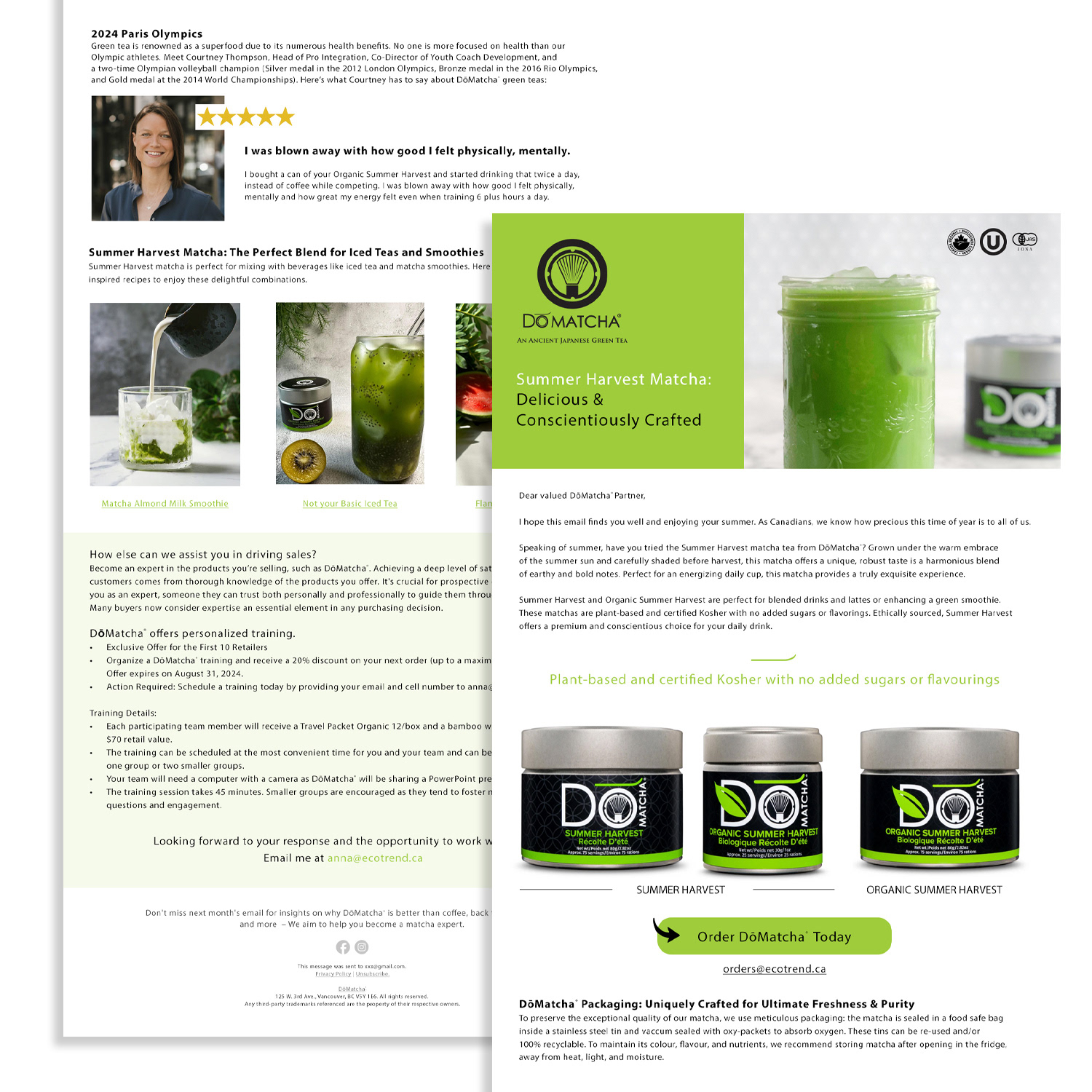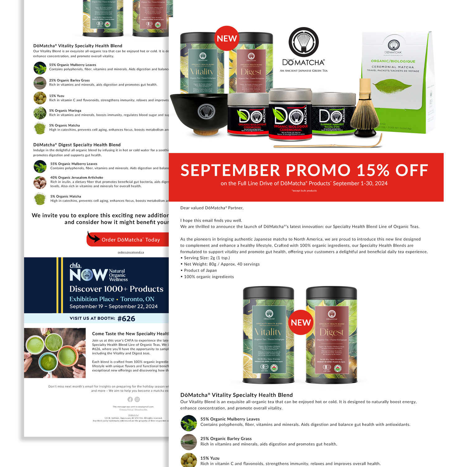 Crafted high-impact emails blending industry insights, dynamic charts, and bold visuals, all aligned with strict brand standards. Delivered clear CTAs and engaging graphics to boost open rates, click-throughs, and conversions while reinforcing DōMatcha’s premium positioning in the natural products channel.