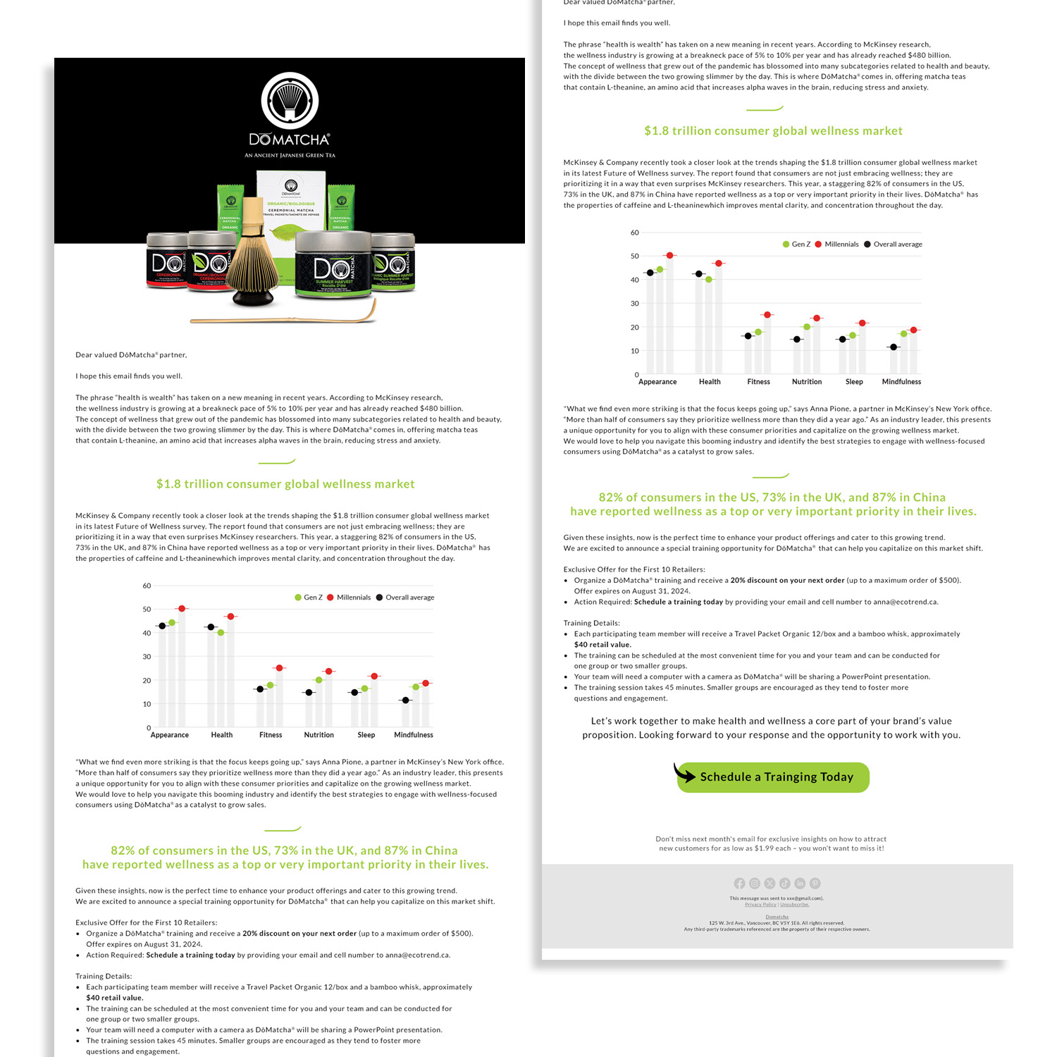 Targeted two core goals: triggering inventory reorders and booking in-store training demos—empowering retail staff with deep product expertise to recommend DōMatcha with confidence. Built high-impact animated emails fusing industry trends, interactive charts, and fluid motion graphics, all locked to DōMatcha’s brand standards.