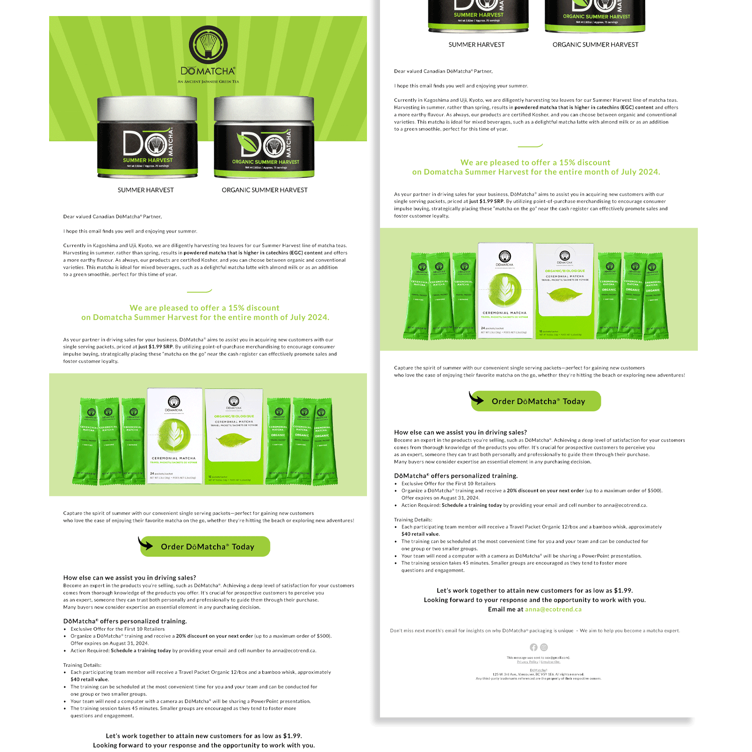 Designed and executed monthly B2B email campaigns promoting authentic Japanese DōMatcha matcha to grocery retailers across North America. Analyzed consumer demand, engagement metrics, and site traffic to optimize content and drive measurable results. Focused on two key objectives: prompting inventory reorders and securing in-store staff training demos—equipping retail teams with expert-level product knowledge to confidently recommend DōMatcha.