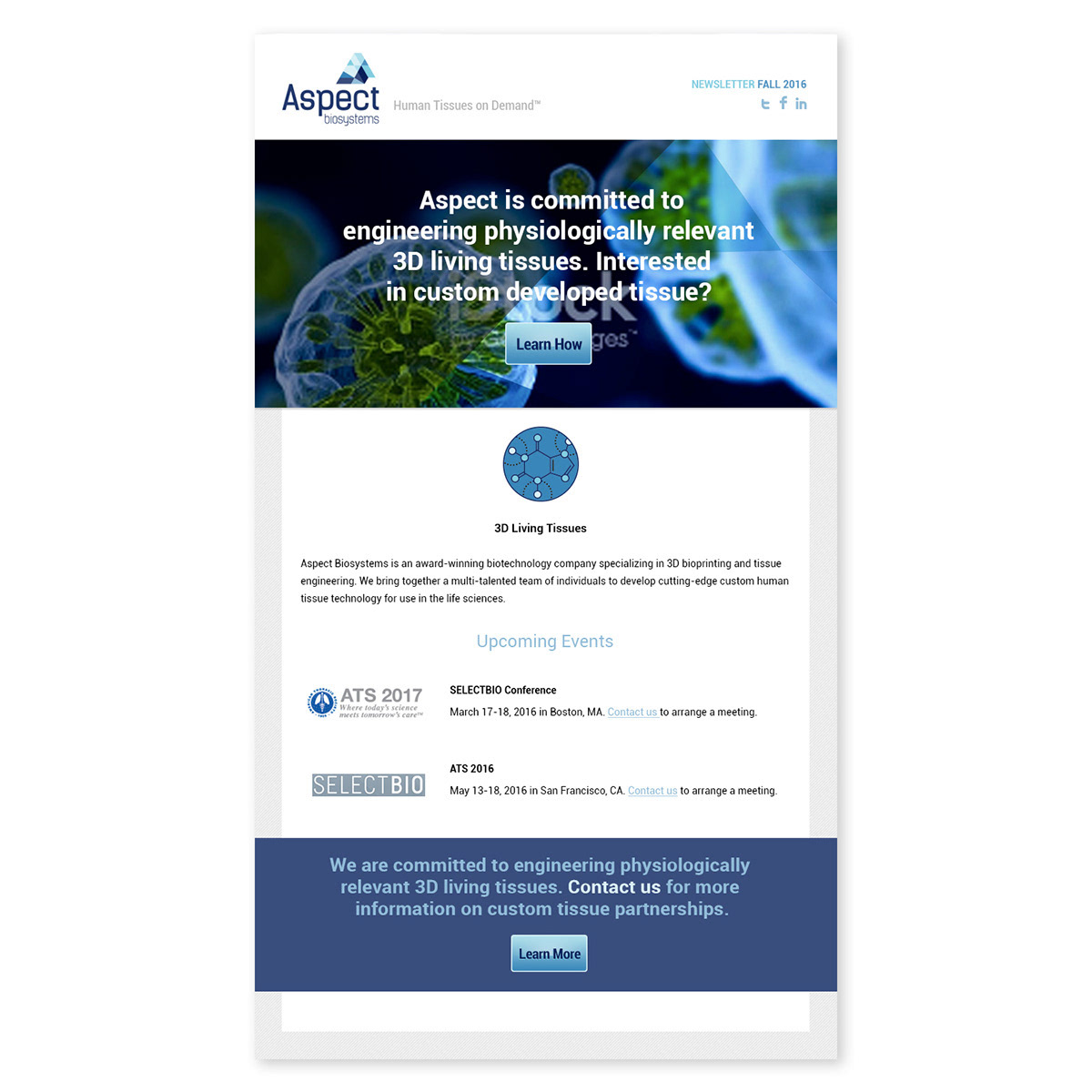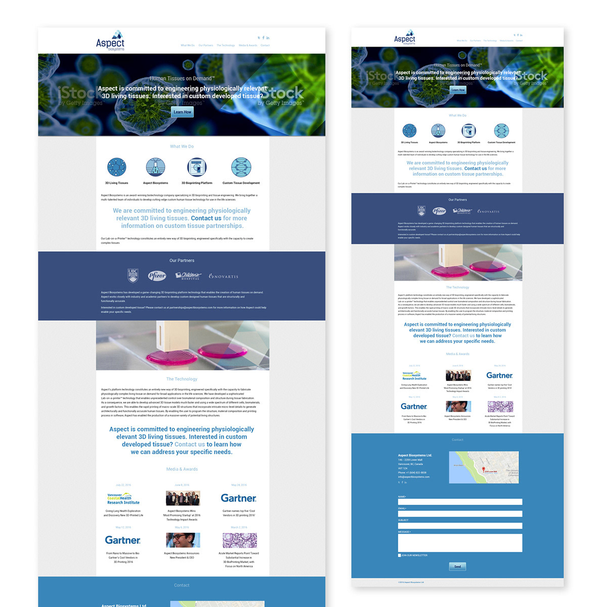 In partnership with Aspect Biosystems, a pioneering leader in bio-printed tissue therapy affiliated with UBC, I led the design and development of a modern email template and website refresh that strengthened their digital presence and professional credibility. Working closely with their team, I helped define clear marketing objectives, integrated analytics for performance tracking, and ensured every element aligned with the brand’s innovative, science-driven identity.