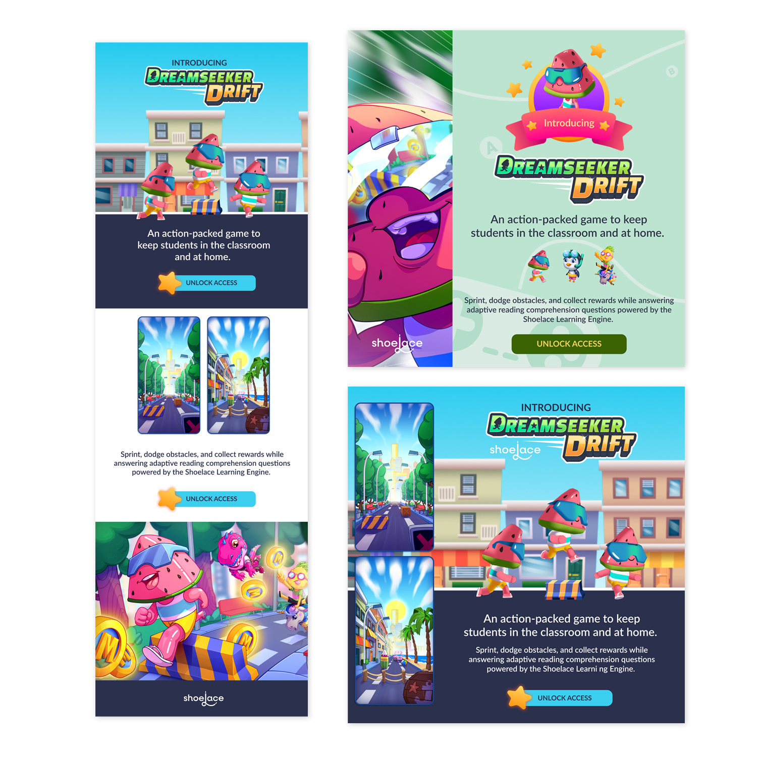 Using Figma, I designed functional and visually compelling digital assets for Dreamseeker Drift, an educational video game that balances intuitive navigation with strong aesthetic appeal to captivate children and young adults. My role encompassed creating a dedicated landing page optimized for user engagement and conversion, alongside a full suite of static marketing materials for a targeted social media campaign to drive awareness, excitement, and participation around the game’s launch.