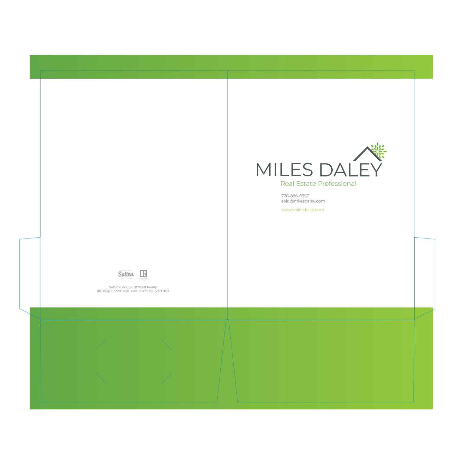 I designed a premium, die-cut presentation folder for Miles Daley Realty that transforms every client handoff from ordinary paperwork into a memorable, high-value experience. Crafted on rich charcoal stock with a luxurious soft-touch finish, the folder features a bold green interior that instantly evokes the brand’s North Shore sophistication, plus a precisely placed orange accent line that adds energy and draws the eye the moment it’s opened.