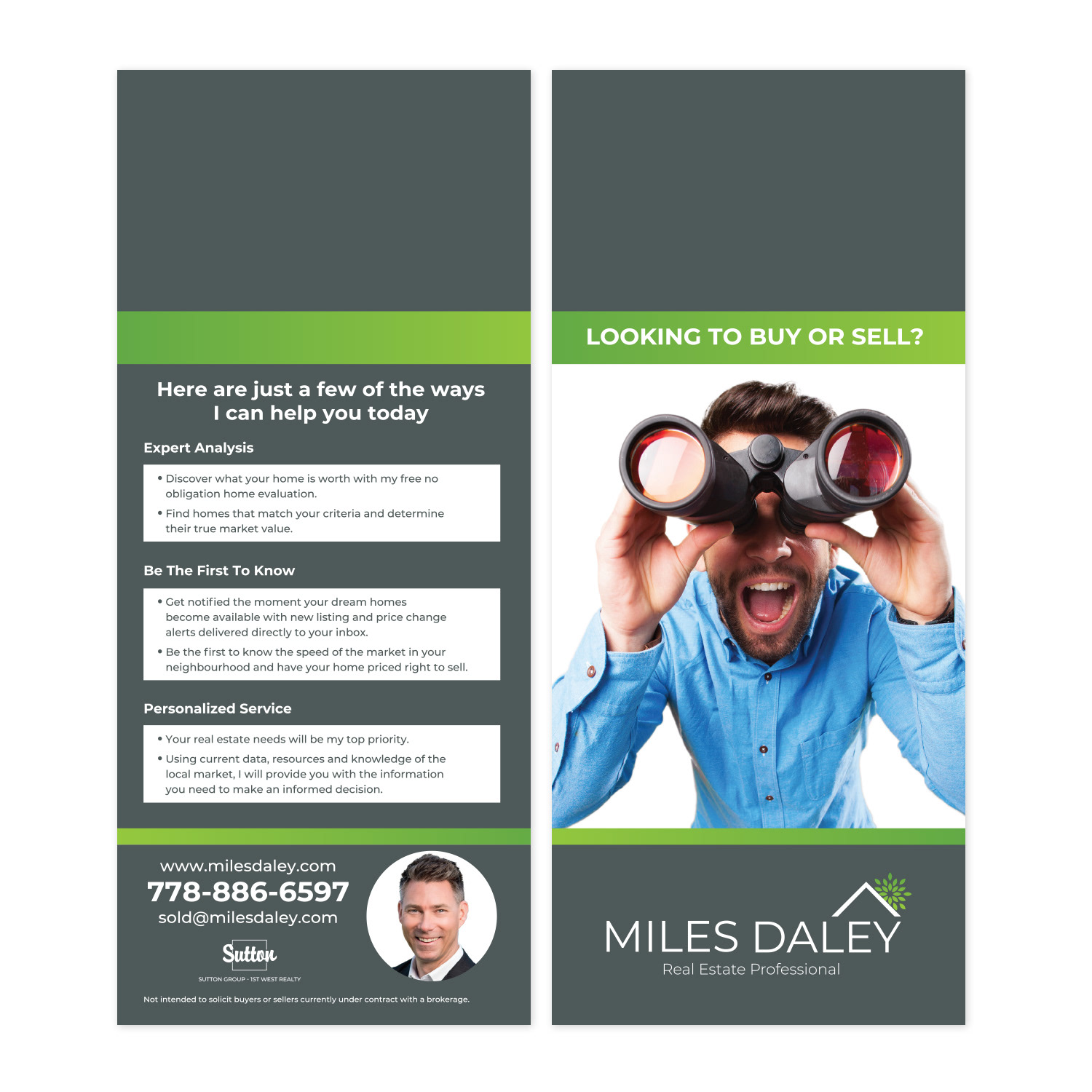 With the new Miles Daley Realty logo finalized, I deployed it across a series of high-visibility, die-cut door hangers designed to turn every neighbourhood walk into a targeted lead-generation opportunity. These custom print collateral pieces feature bold, confident “Looking to Buy or Sell?” messaging placed front and centre, ensuring the fresh brand identity makes an immediate, powerful impression the moment someone reaches for their doorknob.