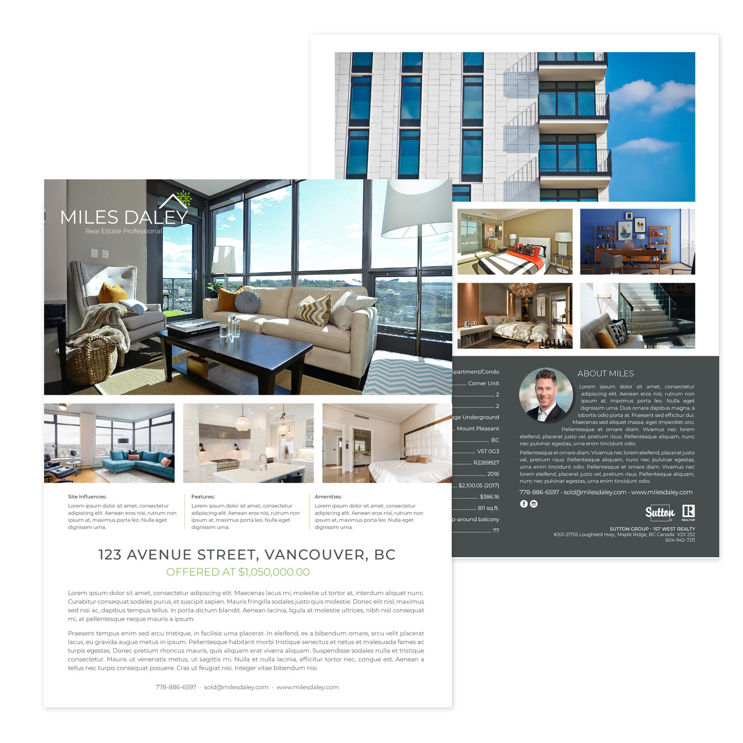 I created a versatile, high-impact two-page fact sheet system for The Miles Daley's agents nationwide, designed to empower every agent to deliver a polished, personalized leave-behind in minutes. Each template seamlessly fuses the core brand, clean typography, sophisticated colour palette, and modern layout, with the individual agent’s personal accents (photo, contact details, bio highlights) and hyper-local market data, creating an ownable, professional document that feels custom-tailored without extra time or cost.