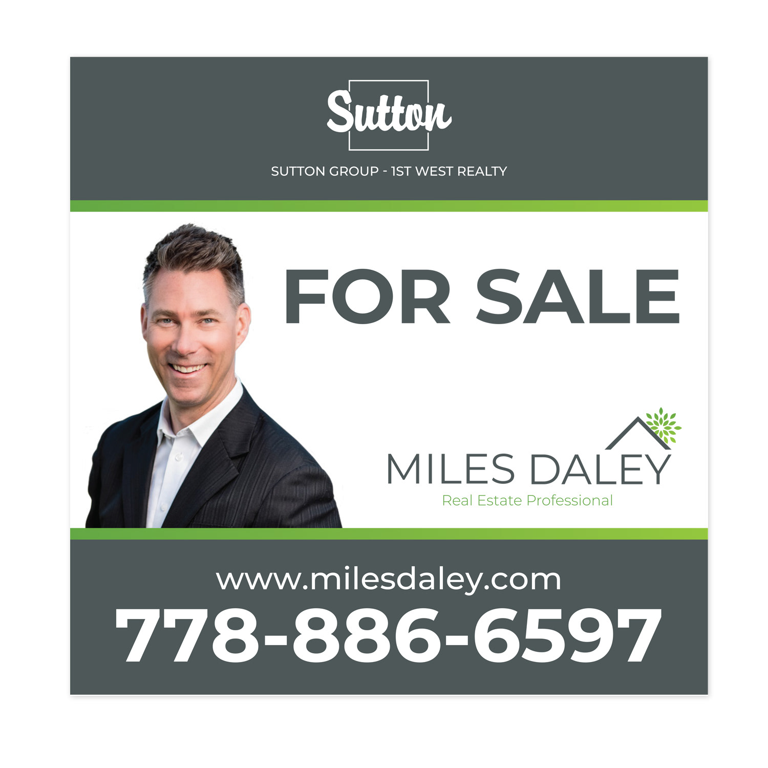 The matching For Sale signs integrate Miles’ professional portrait alongside the Sutton Group logo in perfectly brand-consistent colours, instantly signalling expertise, approachability, and premium North Shore positioning. Both systems were designed for maximum durability, easy transport/setup, and long-distance readability, using high-contrast typography, strategic negative space, and eye-level hierarchy that work day or night.