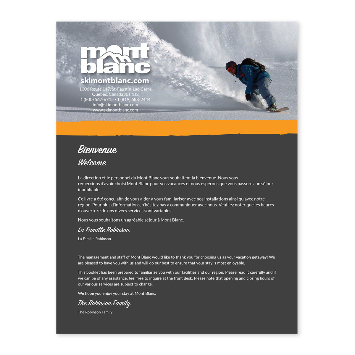 Using Adobe InDesign, I designed and produced bilingual (English/French) in-room brochures and information booklets that served as concise yet detailed reference guides for visitors, delivering essential hotel or property information with clarity, elegance, and full brand alignment. I prepared all files for professional printing by embedding fonts, managing bleeds, colour profiles, and exporting to X1A PDF standards, while sourcing high-quality stock imagery and seamlessly integrating client-supplied photos to create visually appealing, cohesive layouts.