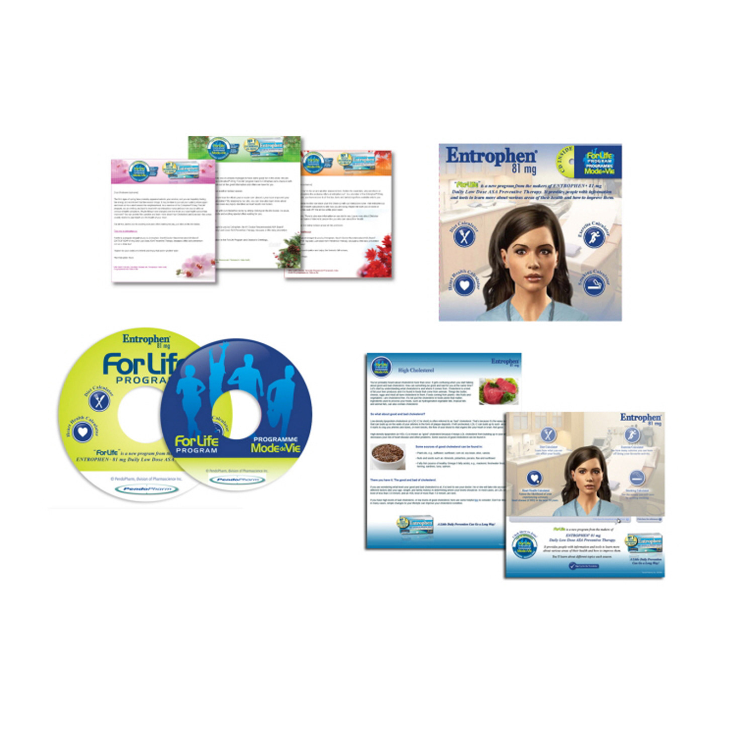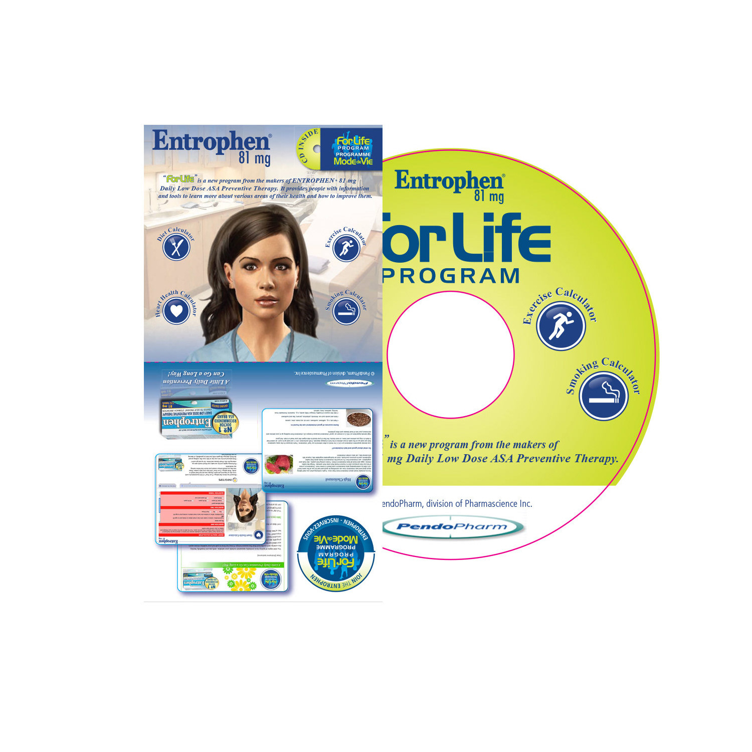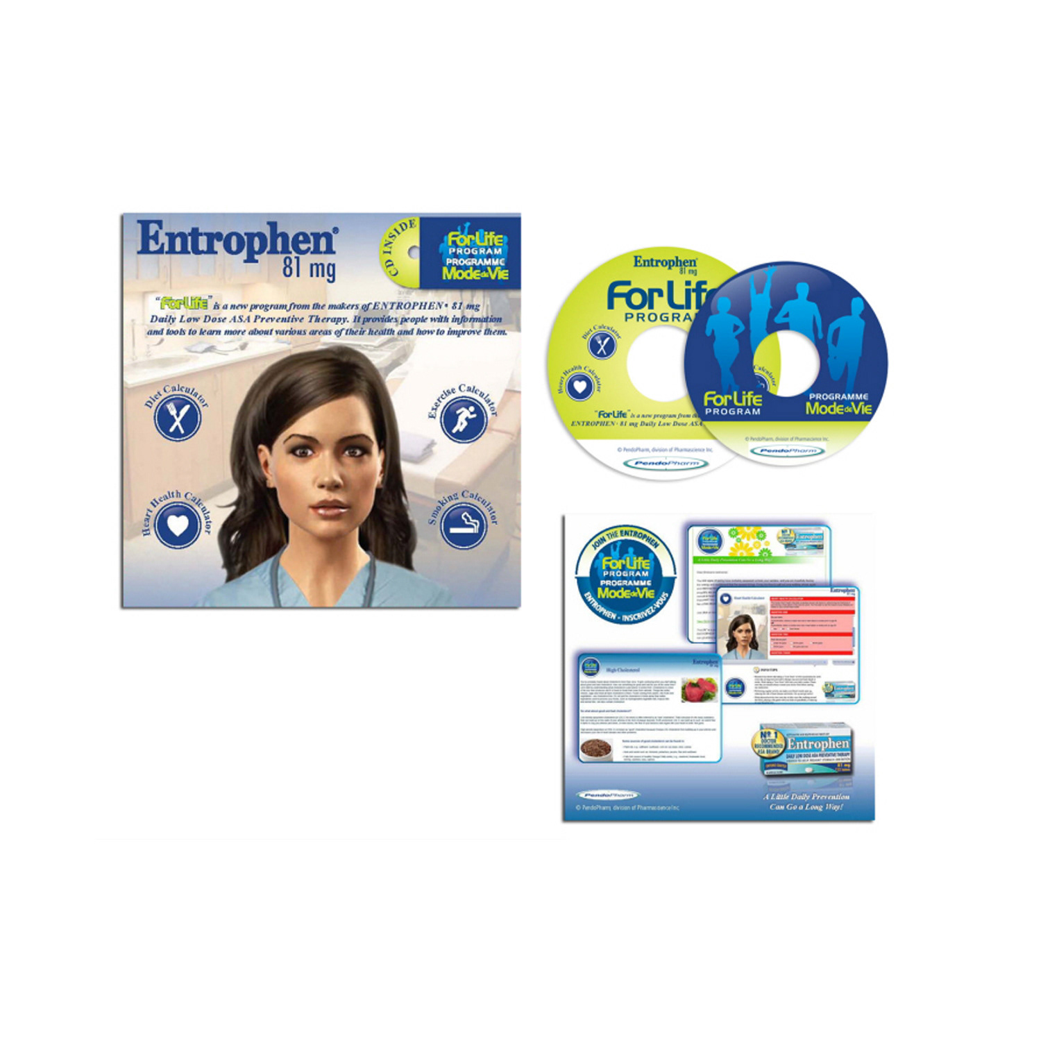 In partnership with a skilled web developer, I led the design and launch of the Entrophen® For Life campaign, delivering a fully bilingual (English/French), PAAB-compliant health website paired with a complimentary interactive CD-ROM for patients managing cardiovascular health and daily aspirin therapy. Upon loading, users were greeted by a friendly avatar nurse who provided personalized guidance through interactive wellness tools, including nutritious recipes, smoking cessation support, tailored exercise programs, and medication adherence tips—creating an empathetic, supportive, and engaging digital experience tailored to mature Canadians.