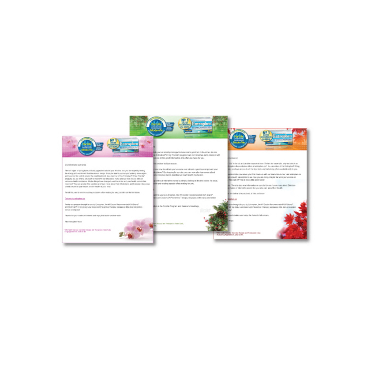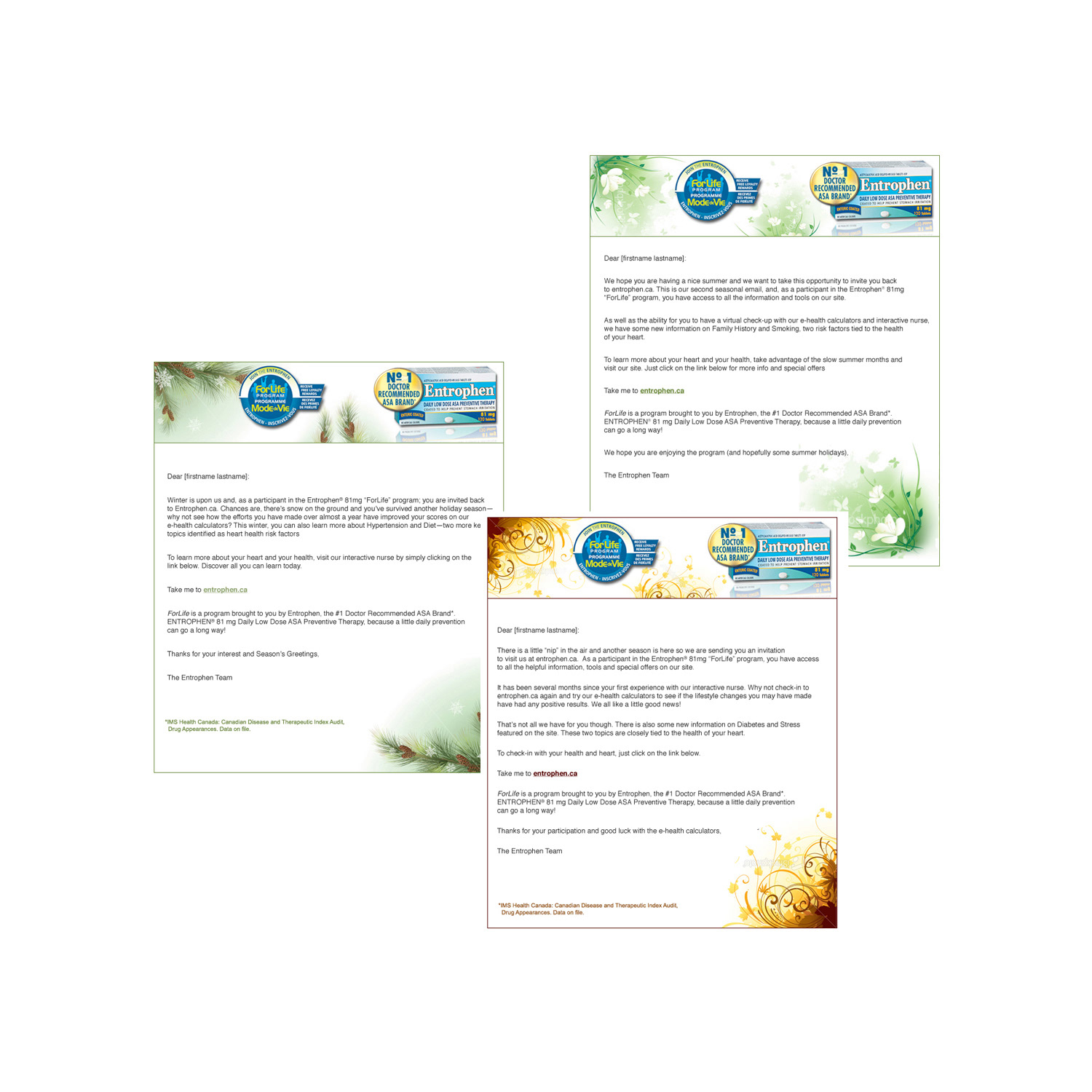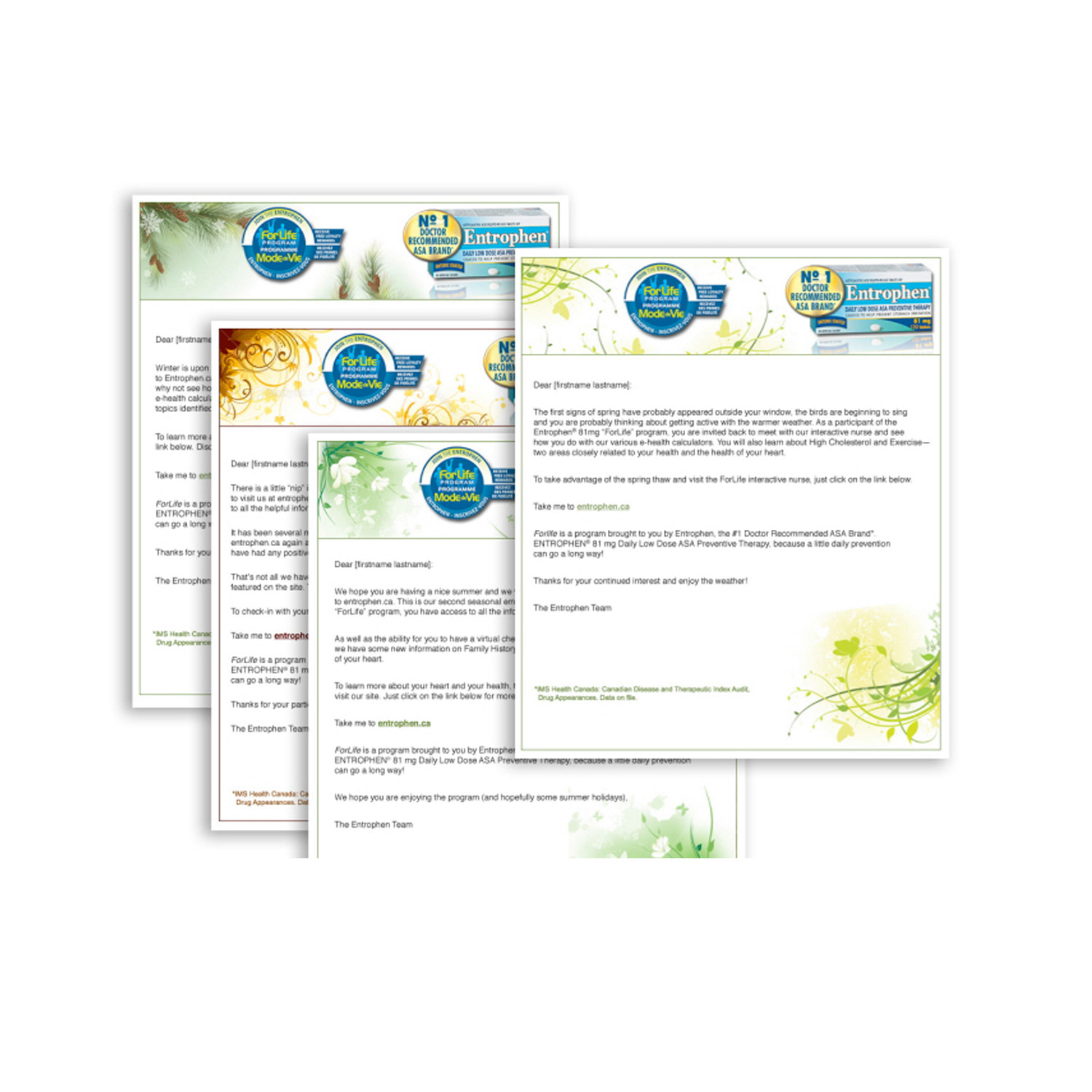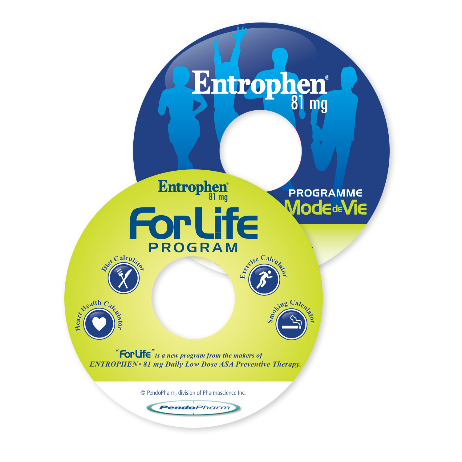 In partnership with a skilled web developer, I led the design and launch of the Entrophen® For Life campaign, delivering a fully bilingual (English/French), PAAB-compliant health website paired with a complimentary interactive CD-ROM for patients managing cardiovascular health and daily aspirin therapy. Upon loading, users were greeted by a friendly avatar nurse who provided personalized guidance through interactive wellness tools, including nutritious recipes, smoking cessation support, tailored exercise programs, and medication adherence tips—creating an empathetic, supportive, and engaging digital experience tailored to mature Canadians.